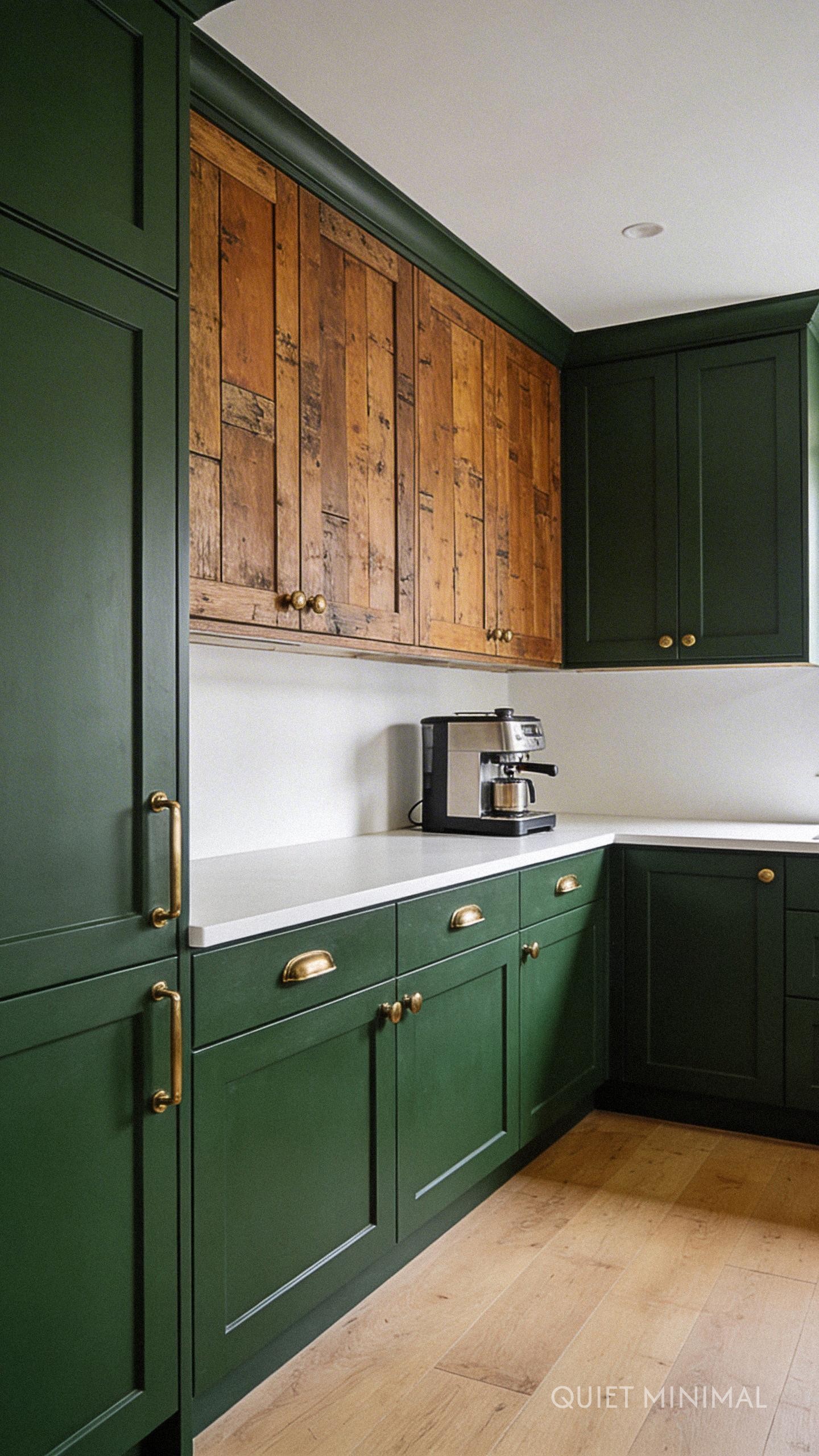 Key Takeaway: Create a sophisticated, grounded look by pairing deep hunter green lower cabinets with the natural texture of reclaimed wood upper cabinets.