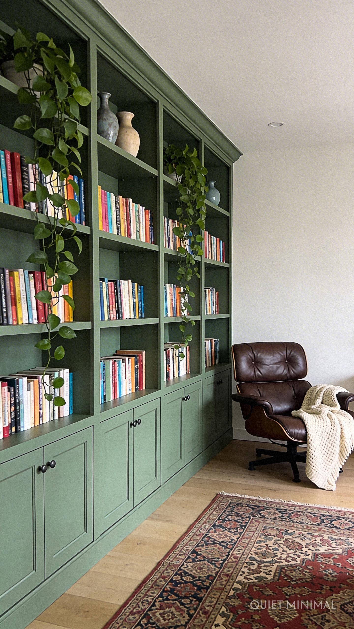 This is also a prime opportunity for a DIY project. You can achieve a high-end custom look using IKEA hacks or basic lumber and molding. Style the shelves with intention—mix your hardcover collection with sculptural ceramics, trailing plants, and framed art to break up the visual weight of the books.