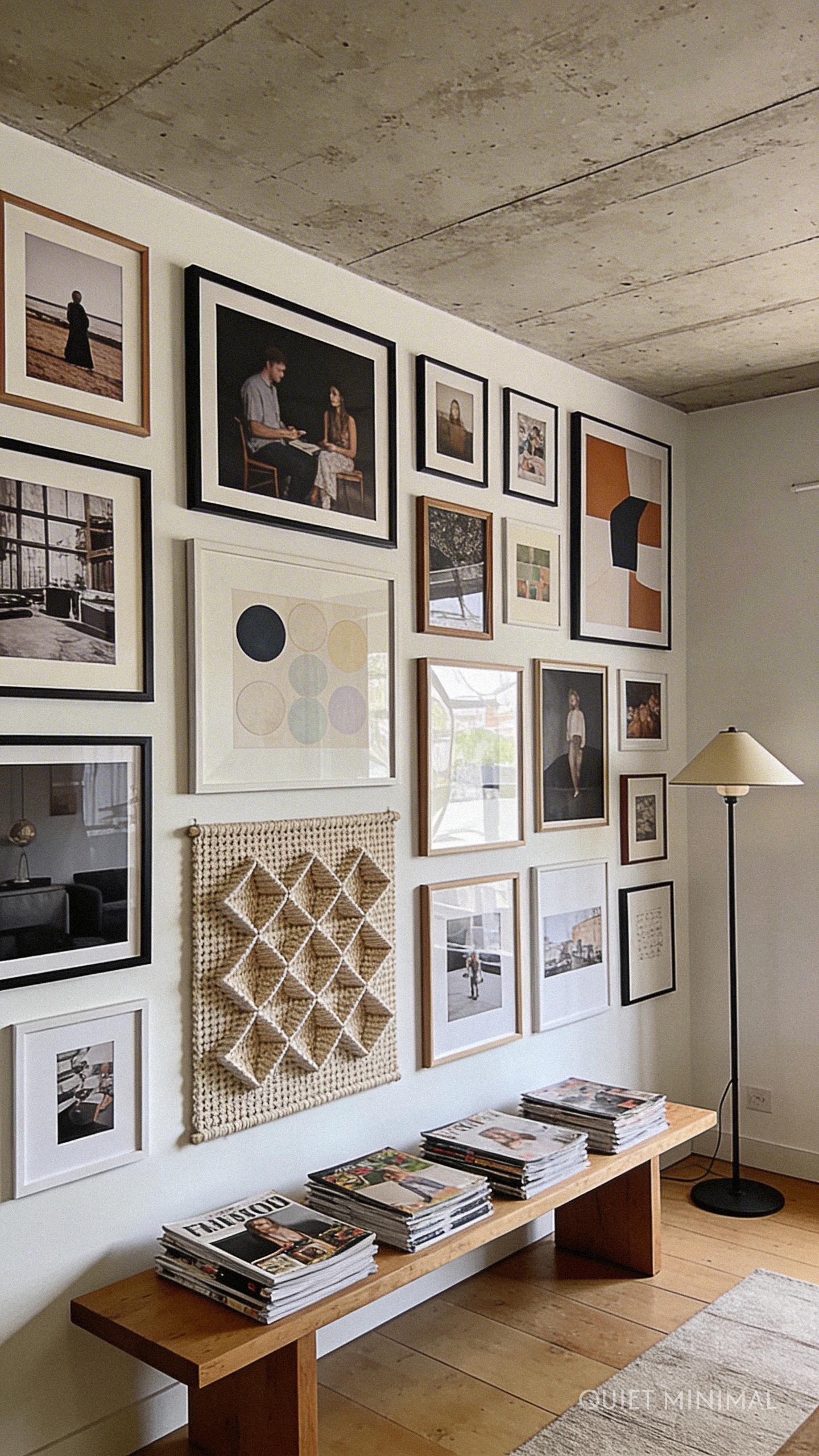 Mix mediums to keep it dynamic—combine photography, abstract prints, and even three-dimensional objects like woven wall hangings or antique masks. If you are a DIY enthusiast, frame your own sketches or fabric scraps. The layout can be organic and evolving; use picture ledges if you like to swap pieces out frequently without patching holes.