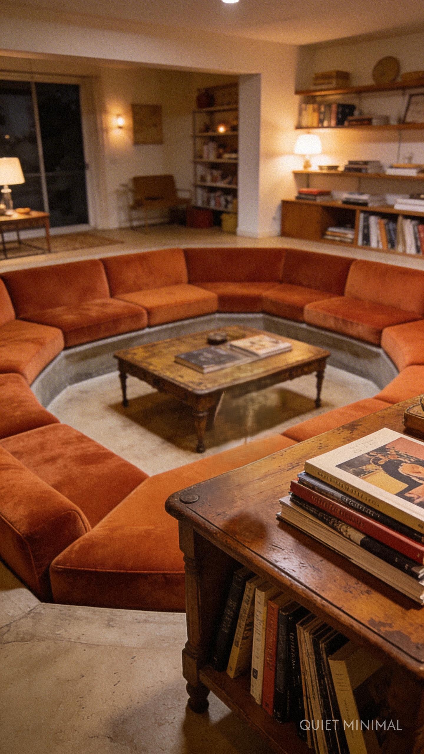 Channel a 1970s conversation pit vibe by using low-profile, modular seating or four comfortable armchairs arranged in a tight circle around a statement coffee table. This layout naturally encourages eye contact and conversation, making it perfect for that glass of wine after the kids are asleep.
