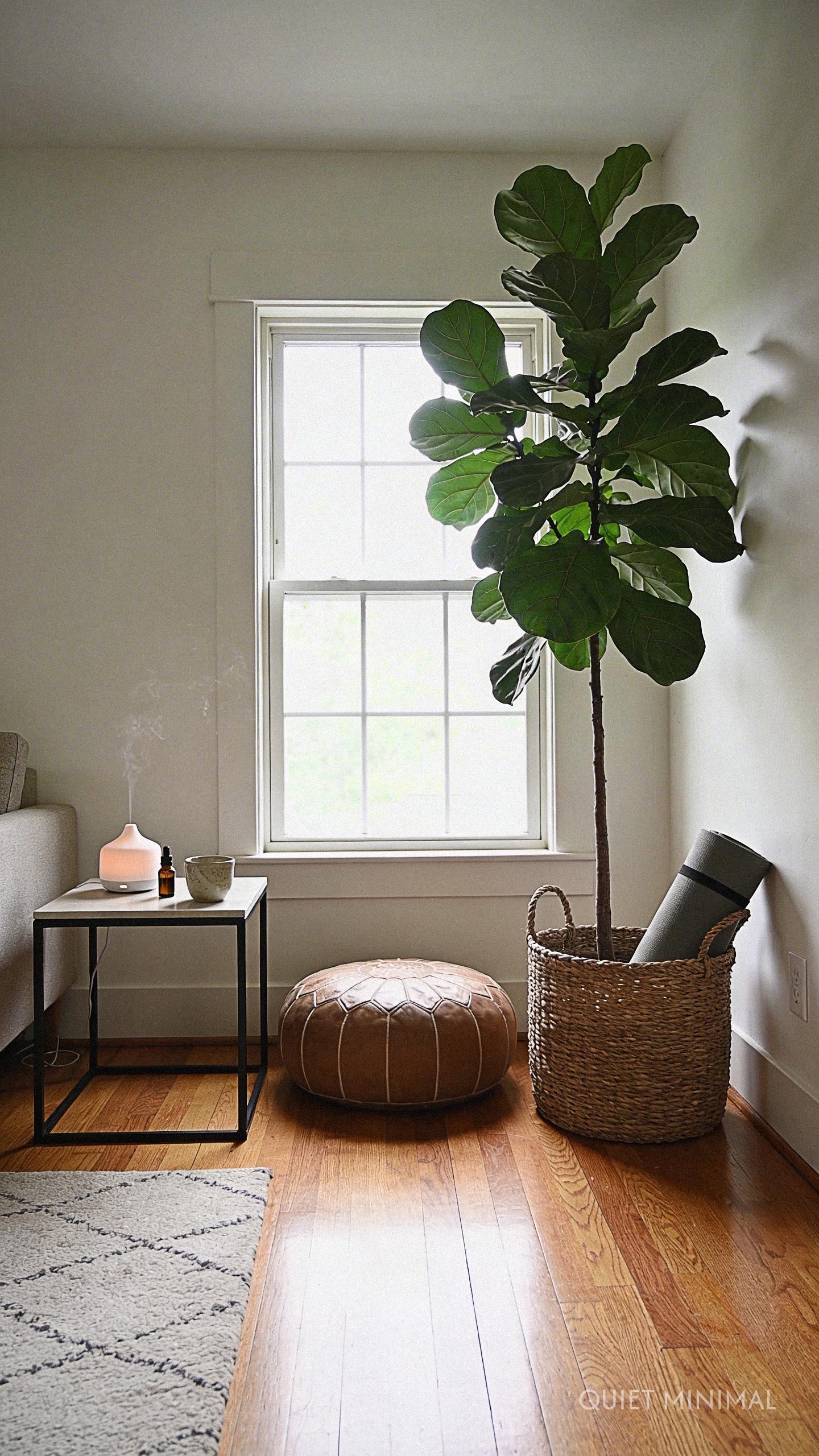 Designate a corner near a window with a large, beautiful plant (like a Ficus or Monstera) and a meditation cushion or a comfortable reading chair. Keep a basket nearby with a yoga blanket, essential oils, and a journal. It serves as a visual reminder to take a breath and reset.