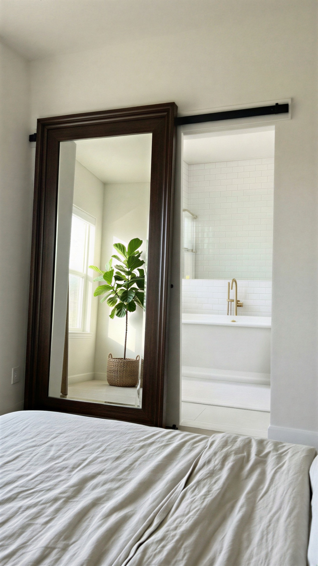 Mirrors are a designer’s best friend for making small spaces feel larger. Using a full-length floor mirror as a door is a sophisticated way to hide an ensuite bathroom or walk-in closet. It reflects light and adds to the “Secret Room Aesthetic” by making the wall appear continuous.