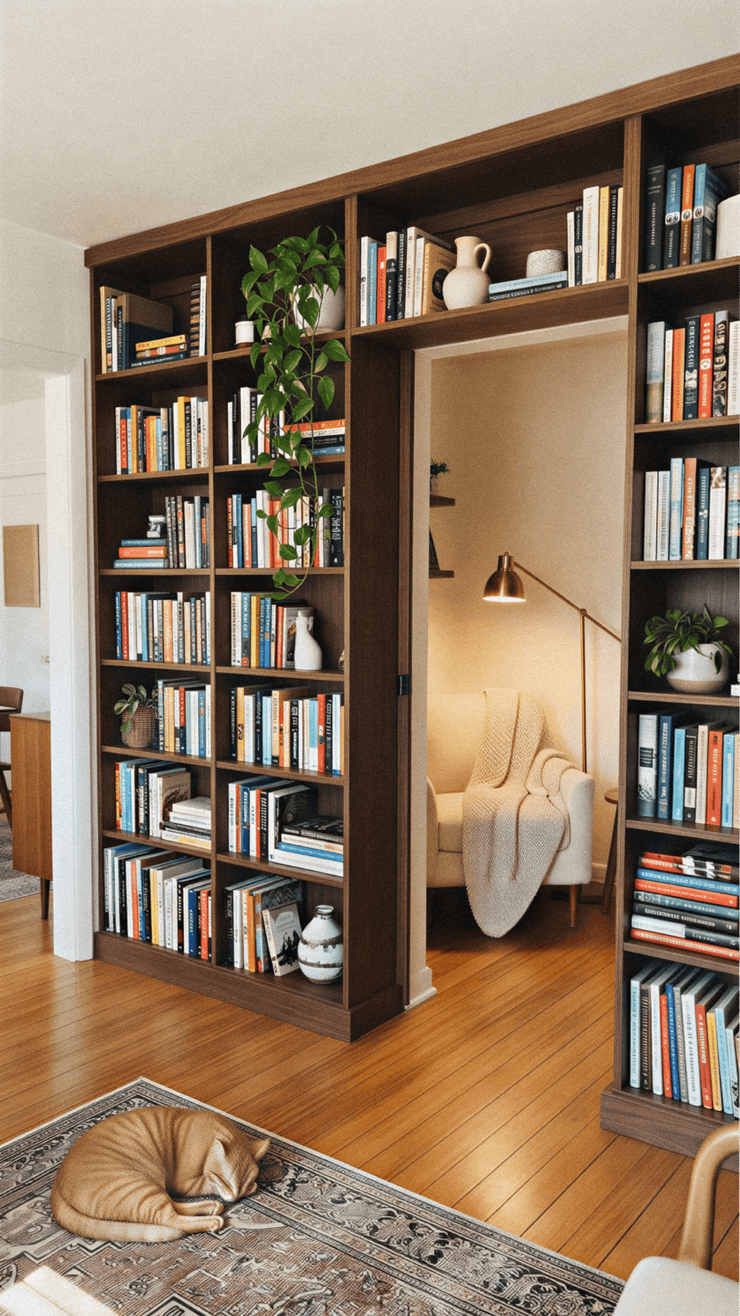 Nothing says “Secret Room Aesthetic” quite like a bookshelf that doubles as a door. It creates a seamless visual flow in your living area while hiding a cozy retreat behind it. For Maya, the creative curator, this is the ultimate way to display a beloved book collection while maintaining the clean lines of the room.