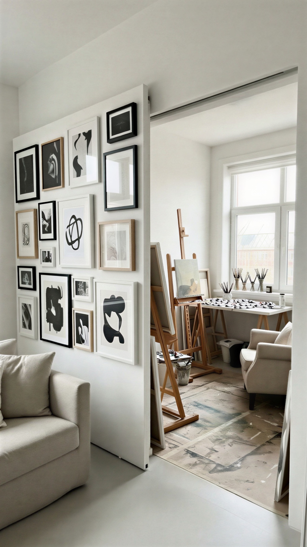 - Uses vertical space to display art while hiding the room.