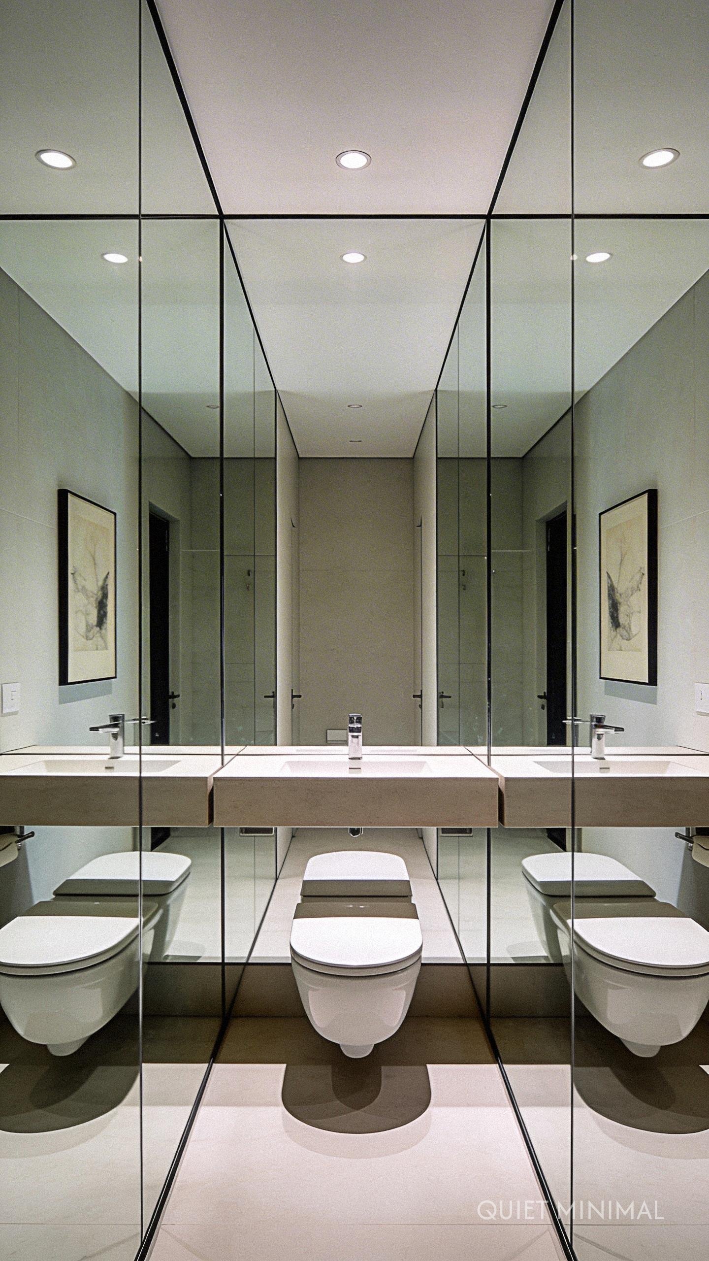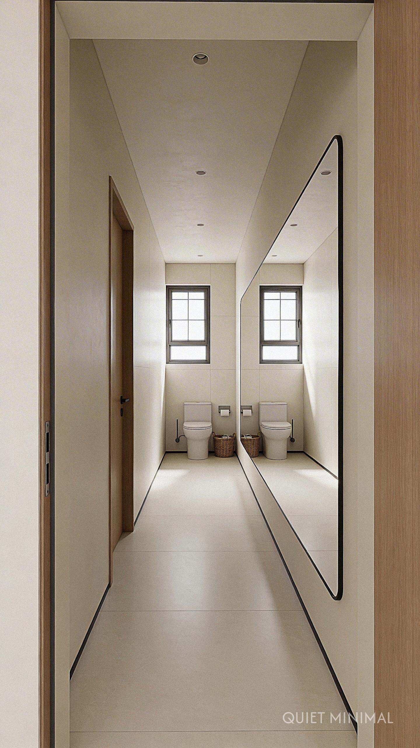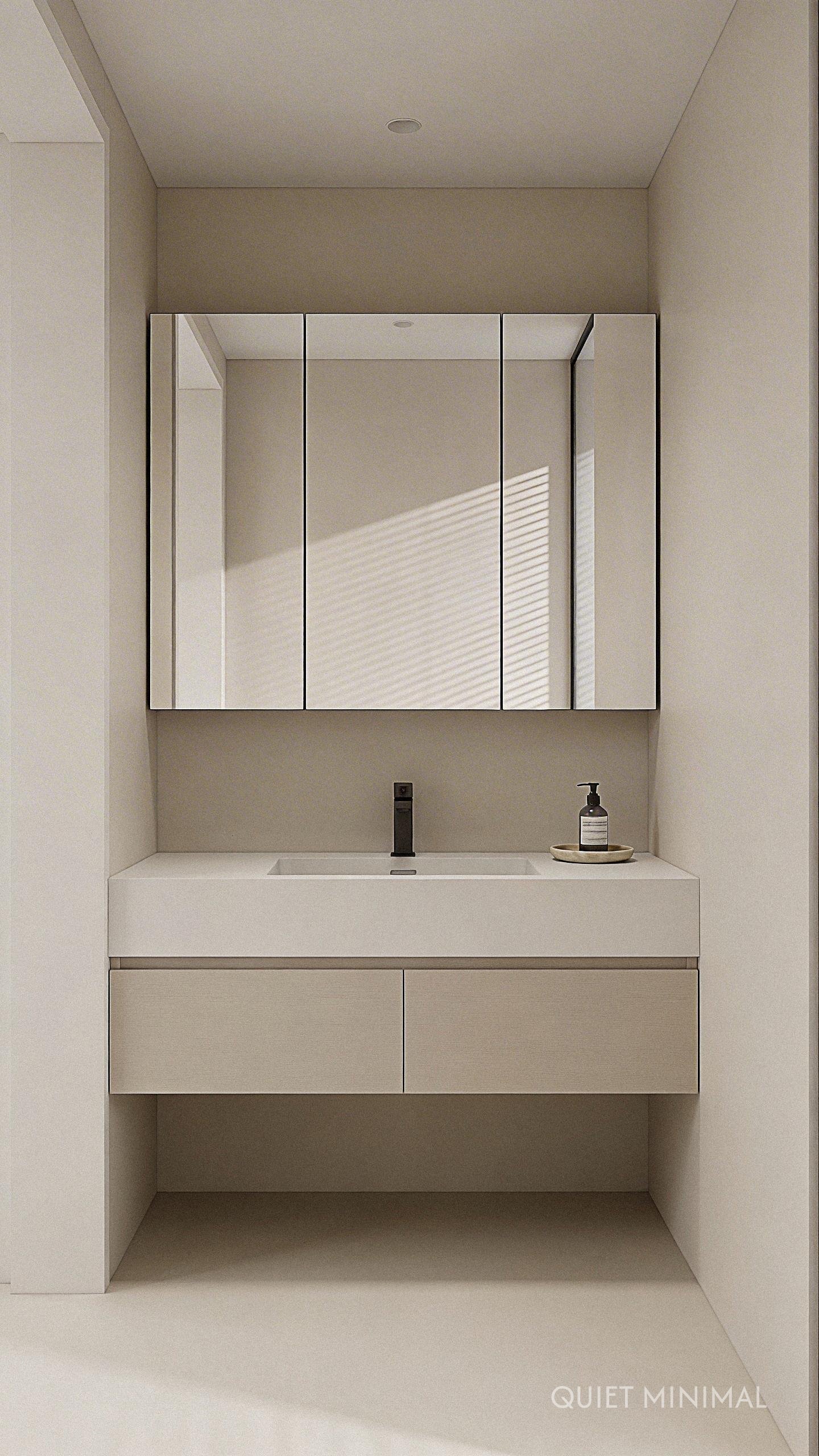 Key Takeaway: Integrate storage with reflection by using large, minimalist mirrored medicine cabinets to keep the space open and organized.