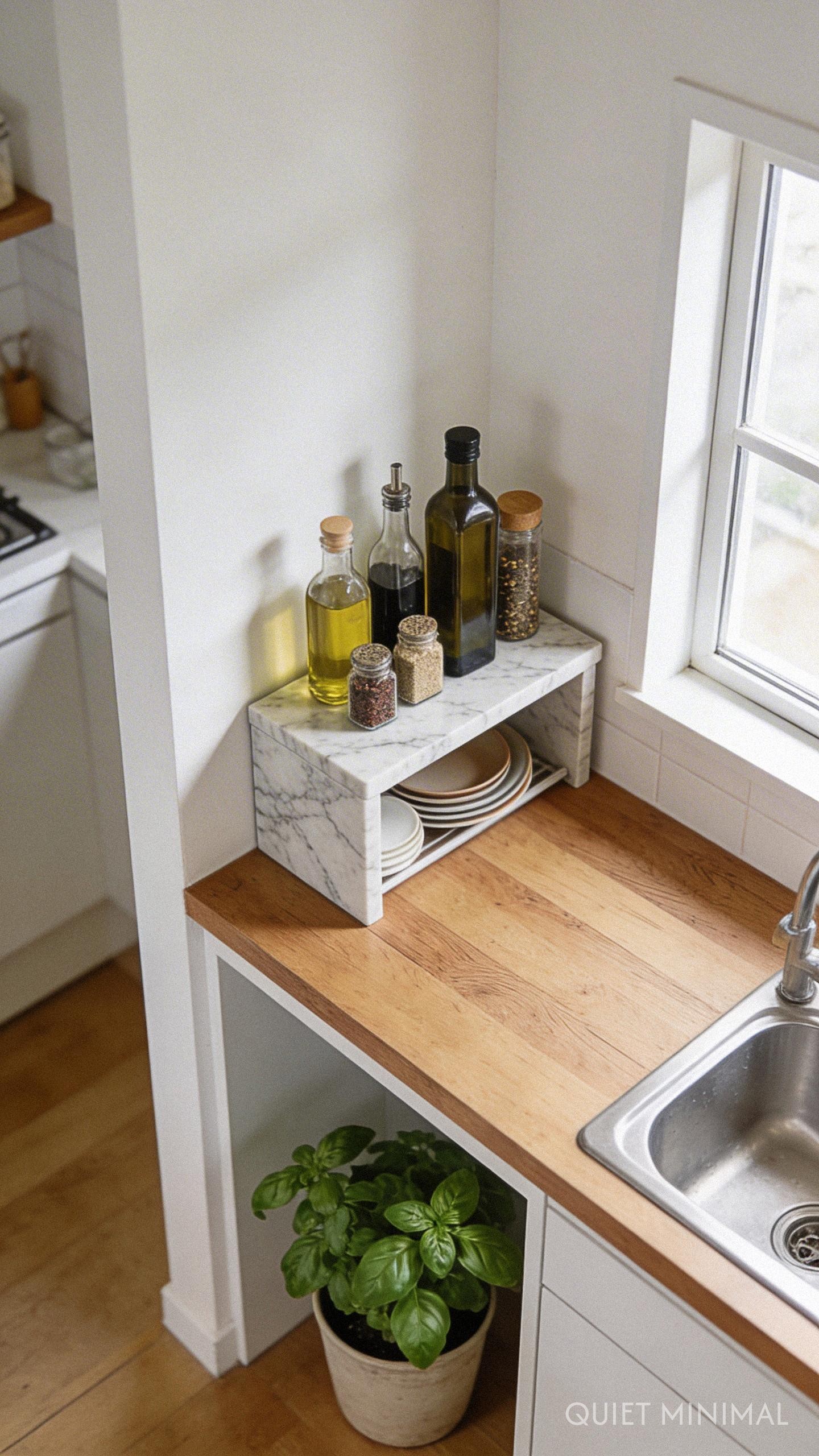 Sometimes you can’t clear the counter, but you can organize it to reclaim space. An elevated shelf riser—often used in cabinets but beautiful enough for the counter—allows you to stack items. Place your curated collection of oils, vinegars, and salt cellars on top of a marble or wood riser. This frees up the counter space underneath for sliding small plates, cutting boards, or recipe books. It creates a tiered effect that looks intentional and styled, rather than cluttered.