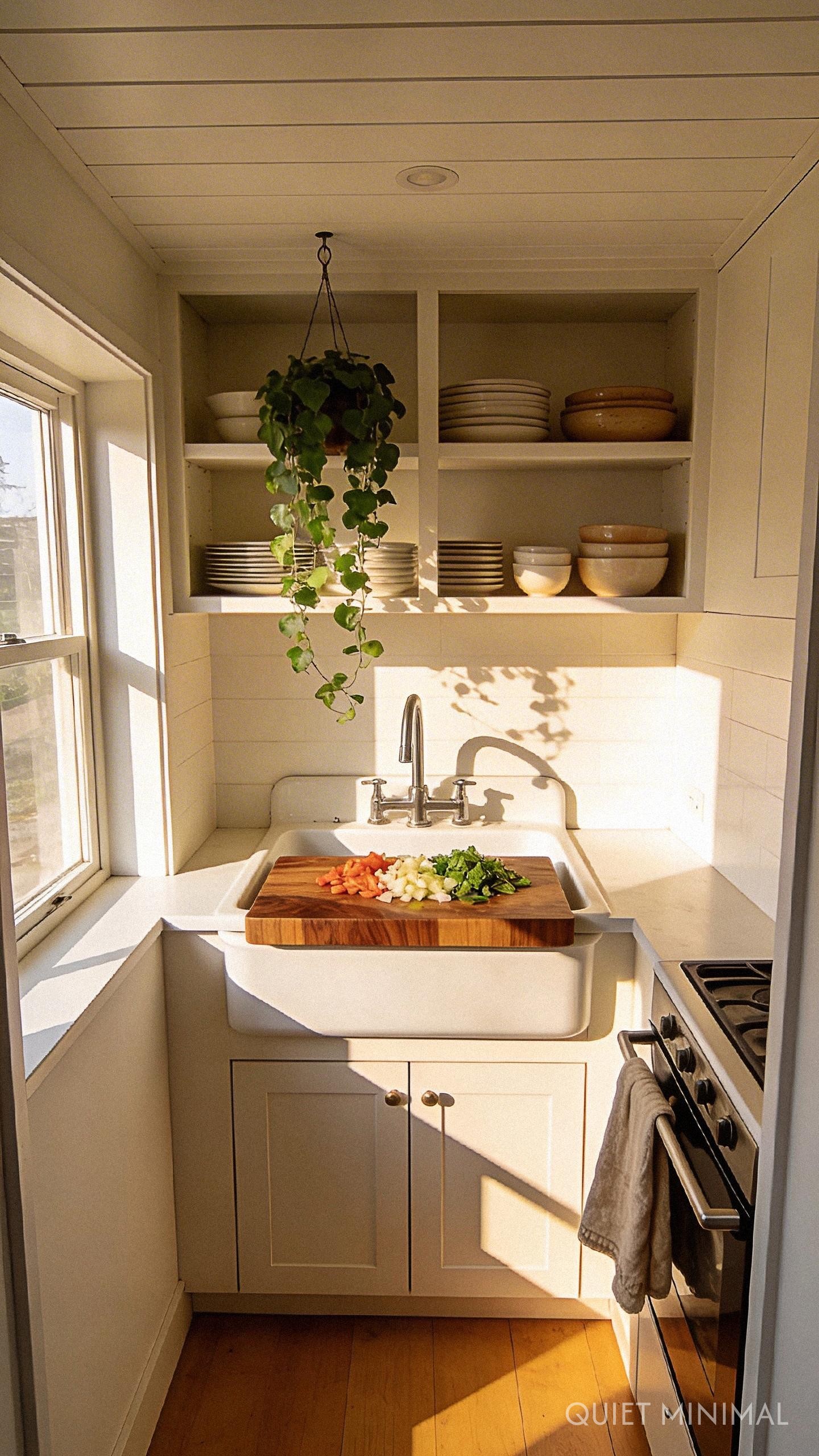 Key Takeaway: Widen your window ledge to create a dedicated “perimeter counter” for plants and lighter tasks.