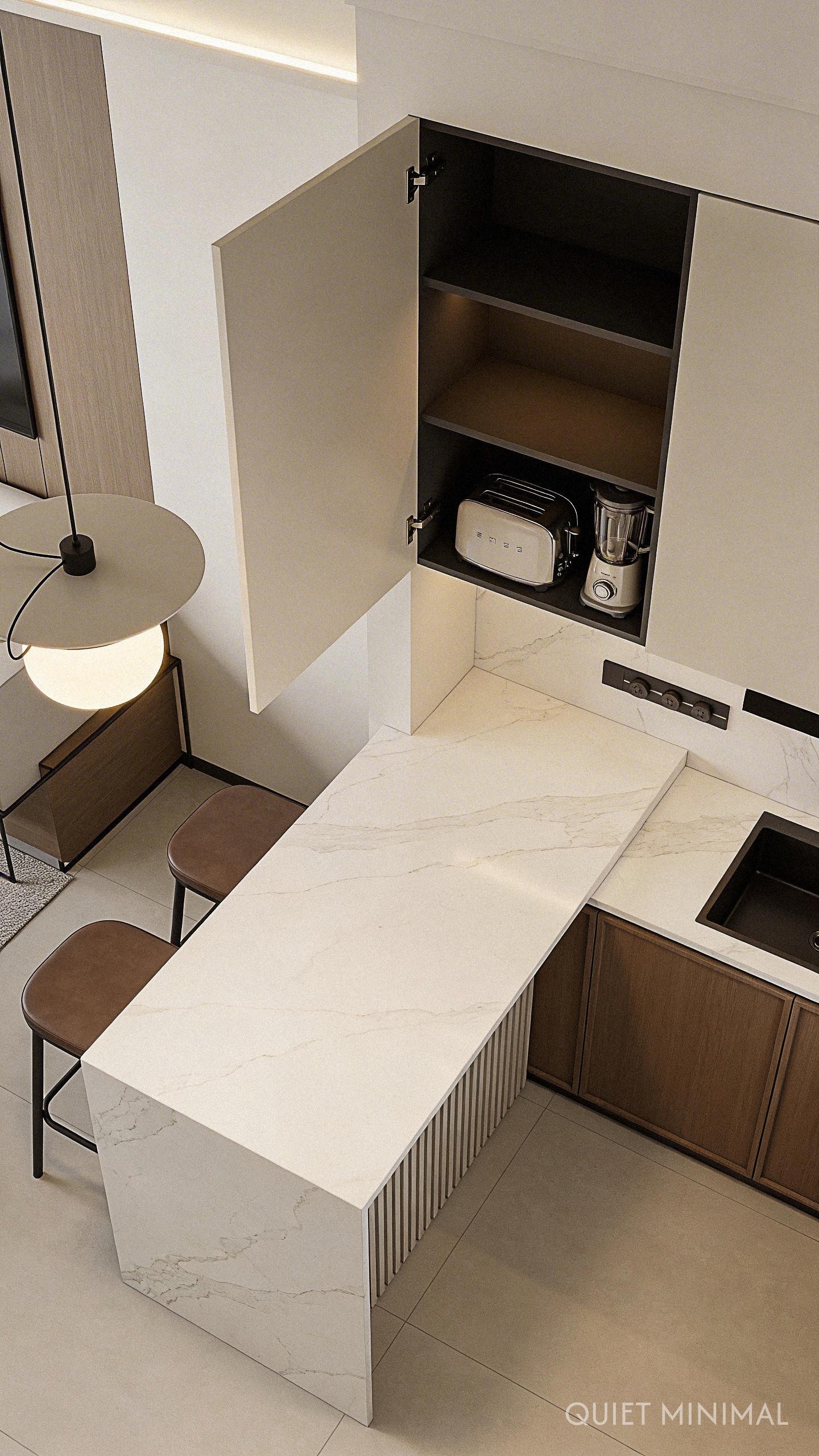 Key Takeaway: Use a mobile cart to bring the counter space to you, creating a versatile zone that adapts to your daily rhythm.