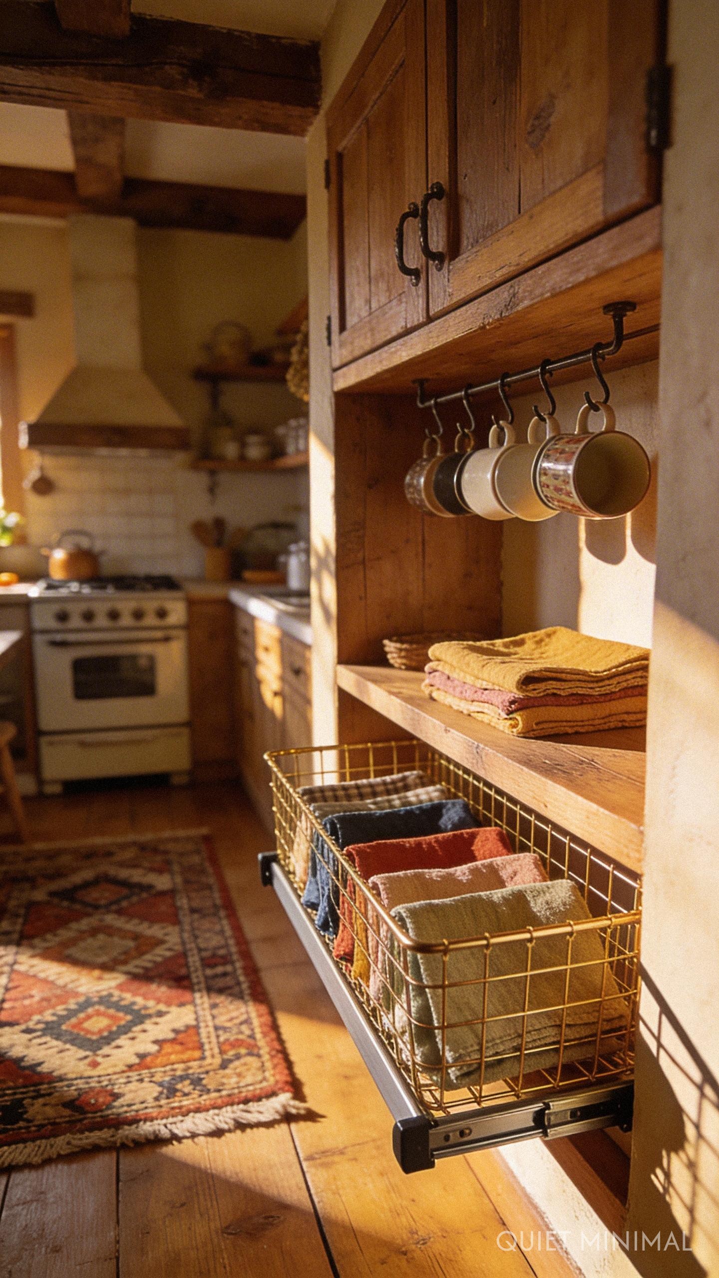 Look at the negative space between your shelves and your countertop. This air gap is often underutilized. Slide-on wire baskets (in gold or copper finishes to match your aesthetic) can hold kitchen linens, produce, or sandwich bags immediately below the upper cabinet. Similarly, screwing hooks into the underside of shelves or cabinets allows you to hang mugs or bananas. This maximizes the cubic footage of your kitchen, ensuring that the actual counter surface remains reserved for active work.
