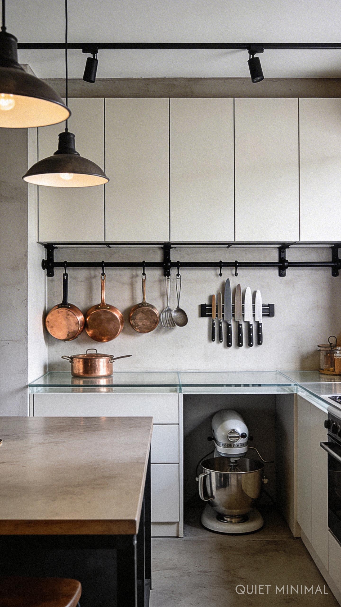 Key Takeaway: Clear horizontal surfaces by migrating tools and ingredients to the backsplash using stylish rail systems.