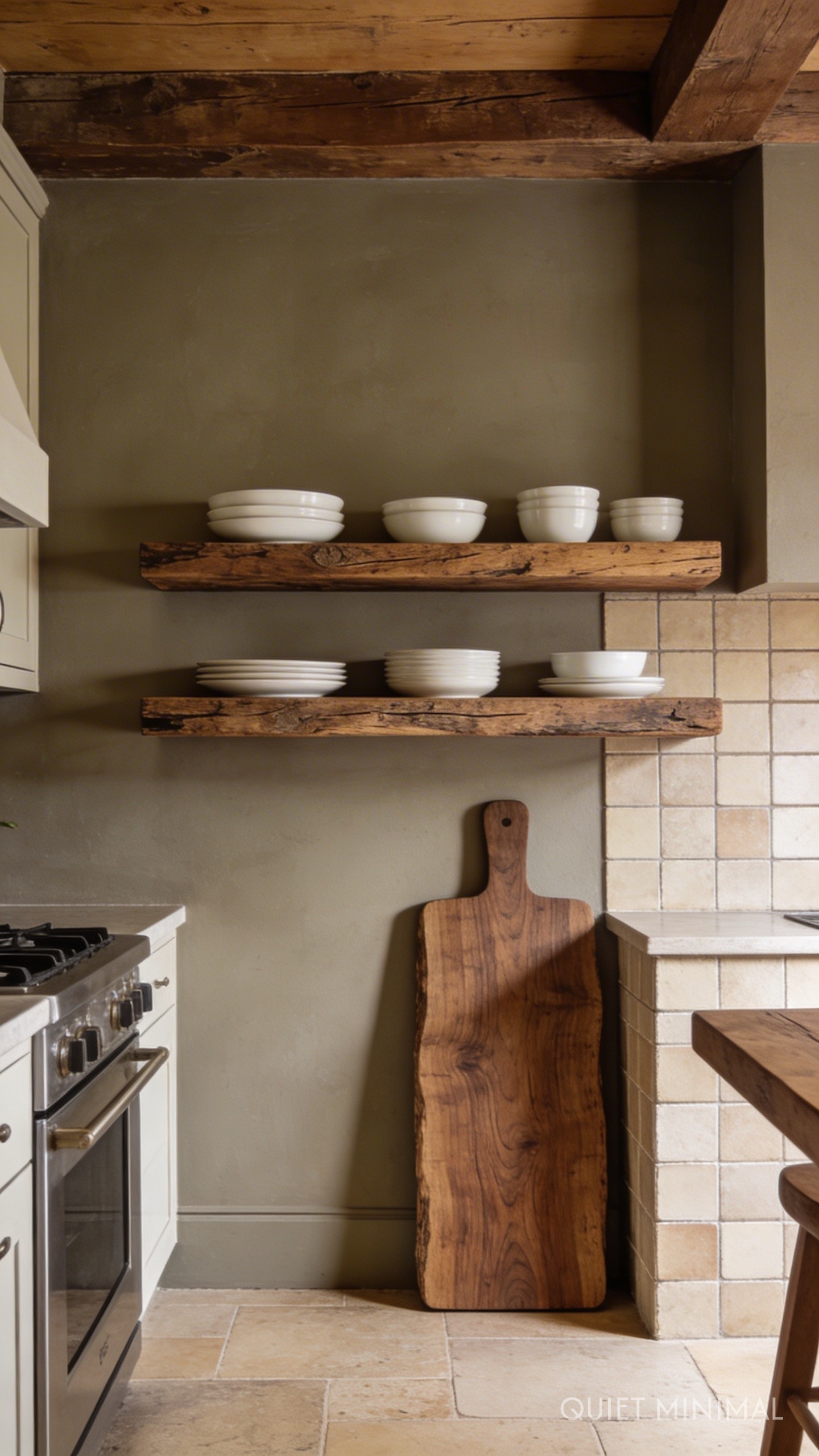 Key Takeaway: Use natural wood through open shelving, cutting boards, and utensils to introduce essential organic texture and warmth.
