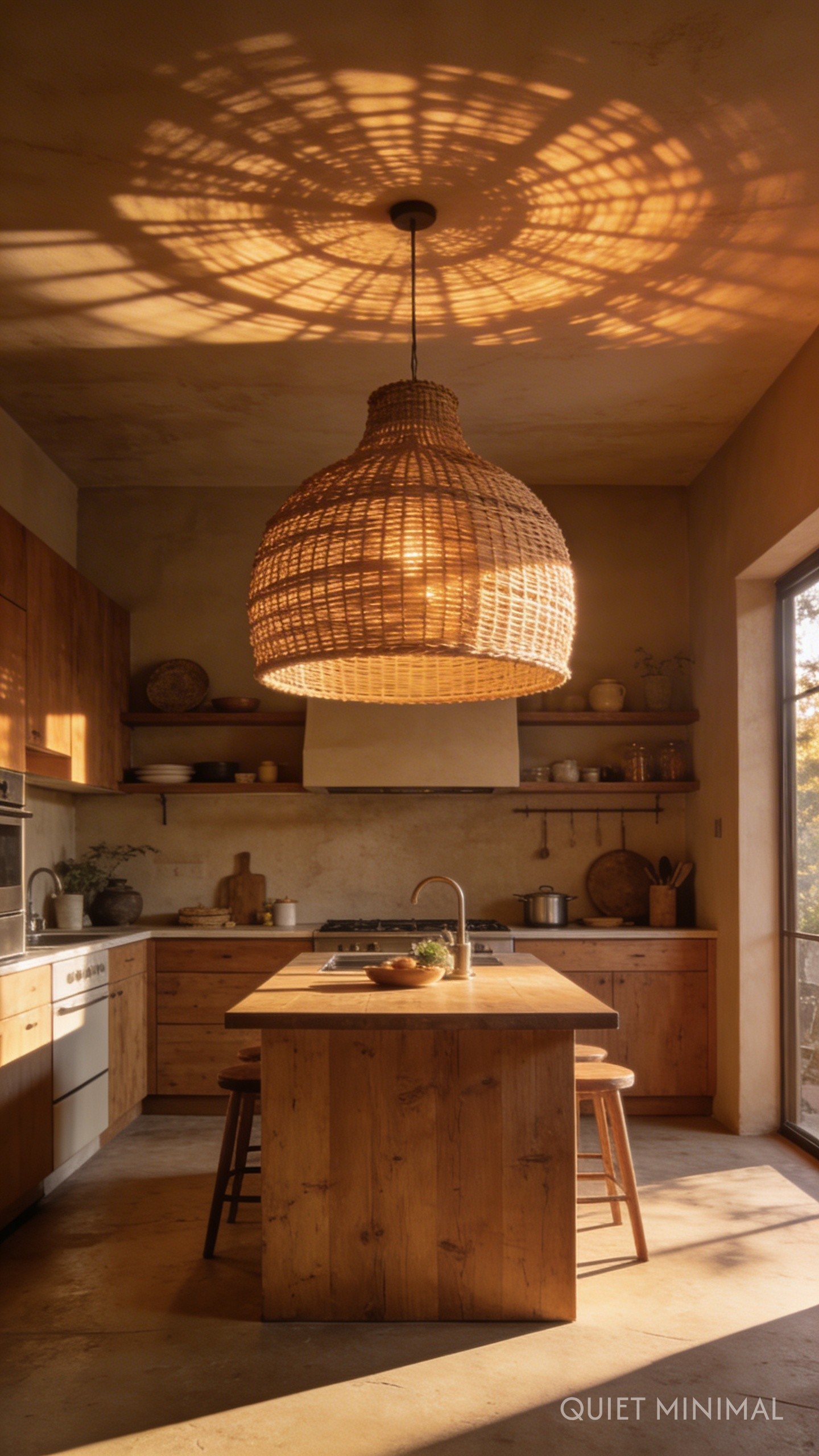 Key Takeaway: Replace harsh lighting with woven rattan or jute pendant lights to add natural texture and cast a warm, diffused glow for a calmer atmosphere.