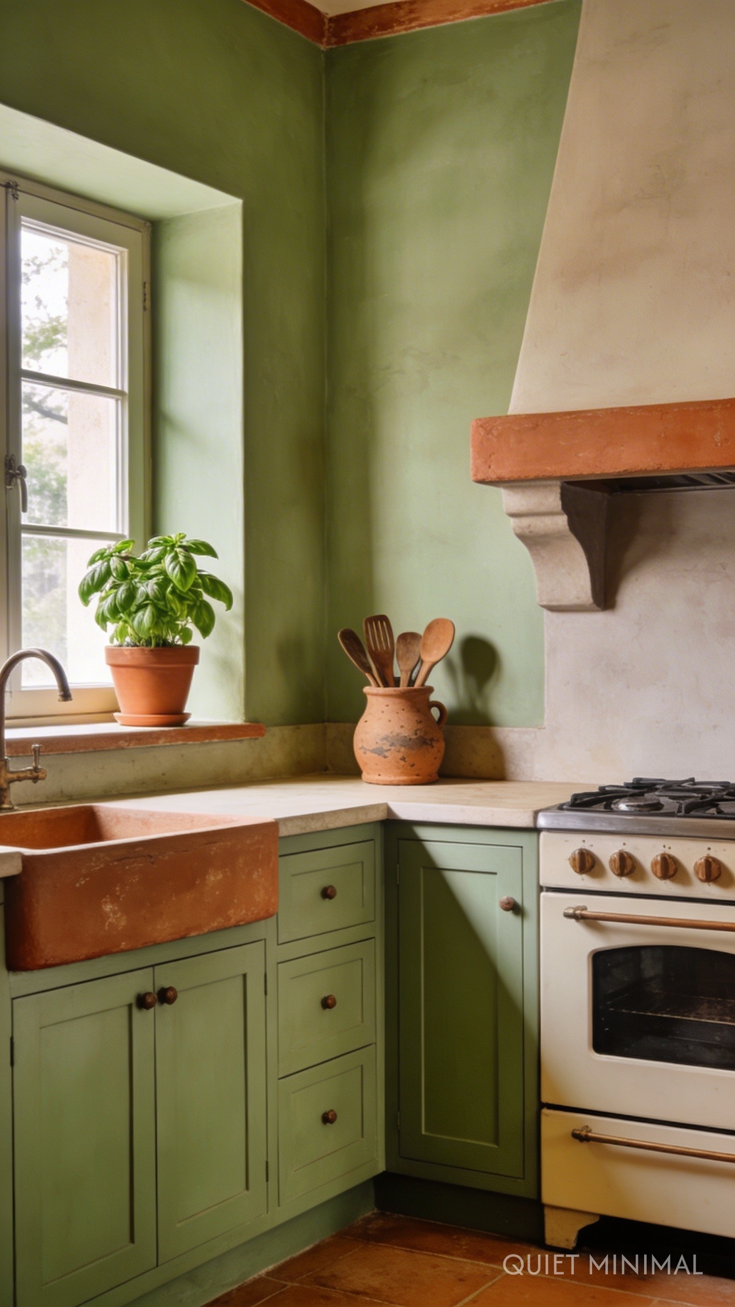 Key Takeaway: Incorporate small accents in terracotta, rust, or clay through pottery, textiles, or decor to add warmth and depth to your kitchen’s color scheme.