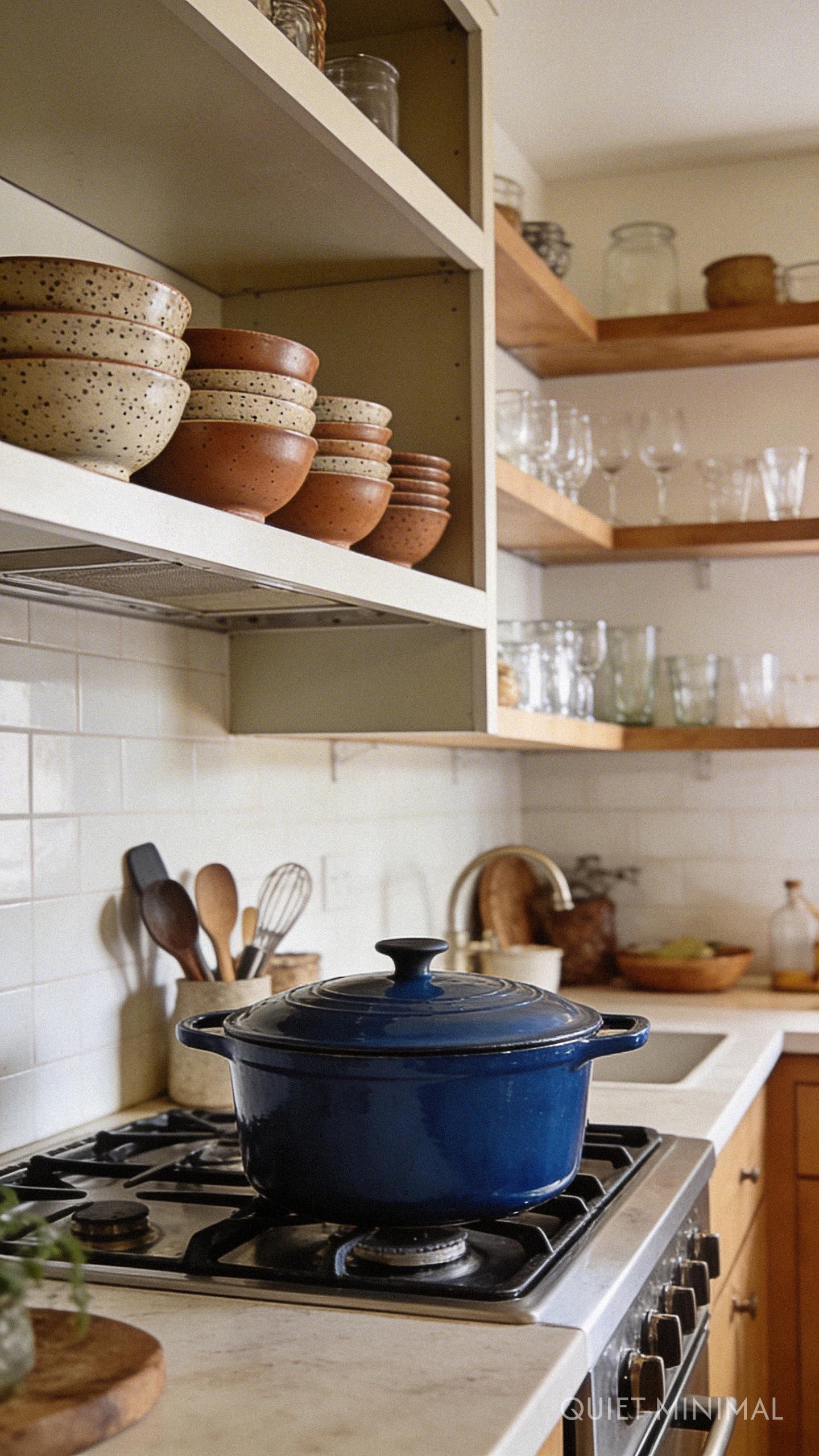 Key Takeaway: Treat beautiful, functional items like Dutch ovens and handmade pottery as decor, displaying them on open shelves or the stovetop to add personality.