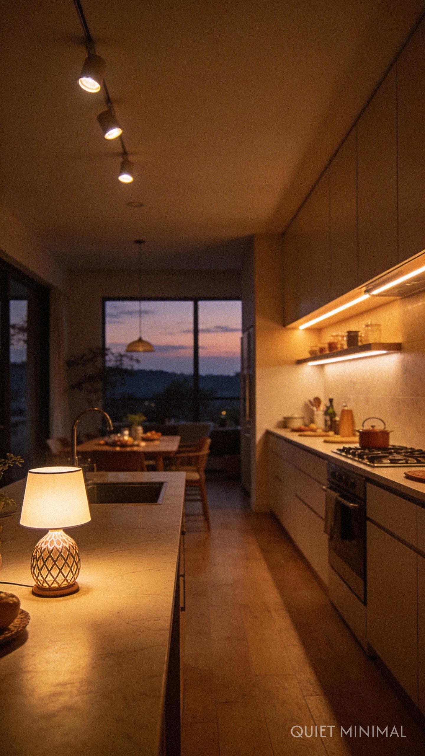 Key Takeaway: Combine dimmable overhead lights, warm under-cabinet LEDs, and a small countertop lamp to create a layered, inviting lighting scheme.