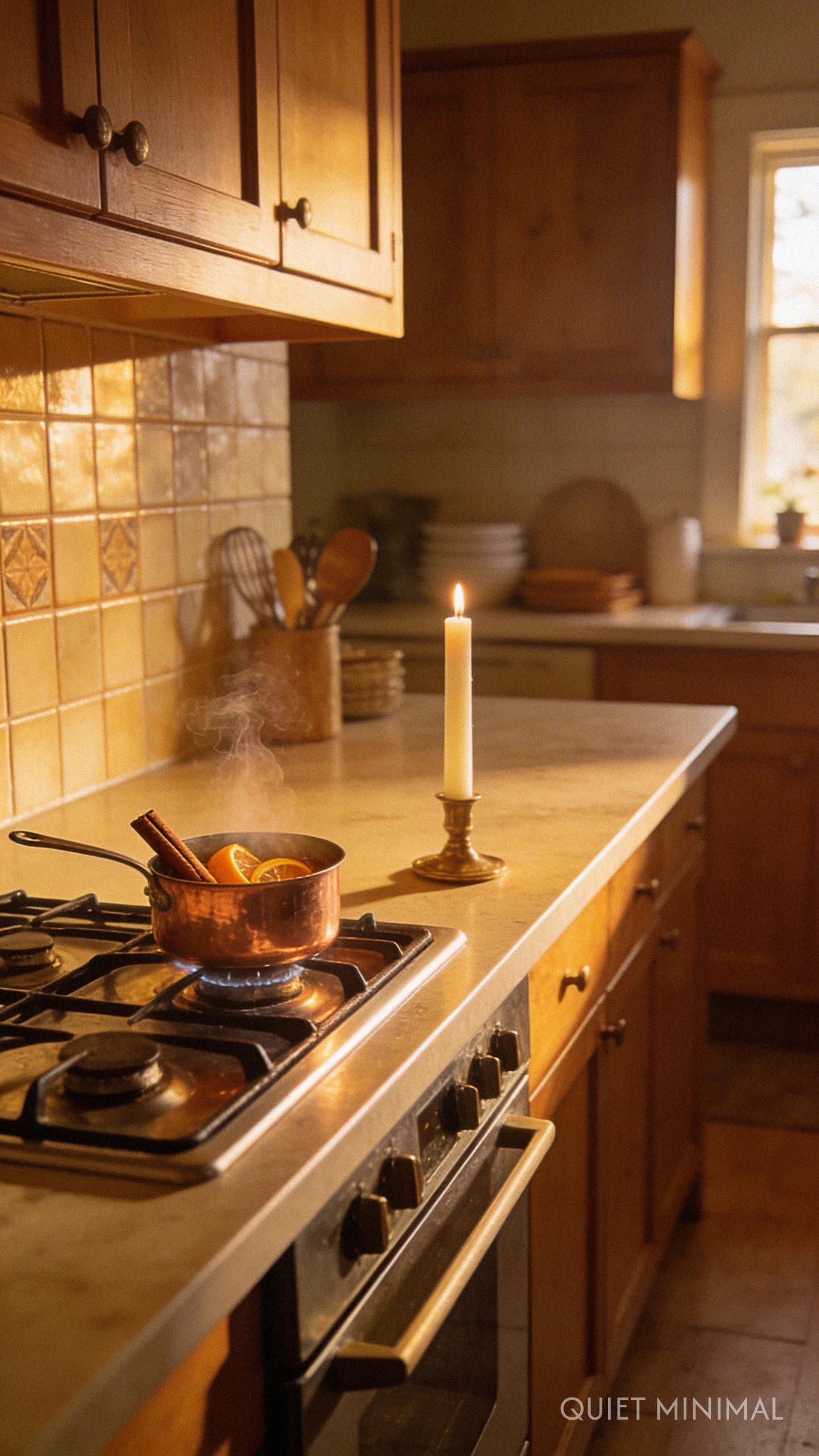 Key Takeaway: Go beyond visual cues by using a stovetop simmer pot, candles, or a diffuser to fill your kitchen with warm, nostalgic scents.