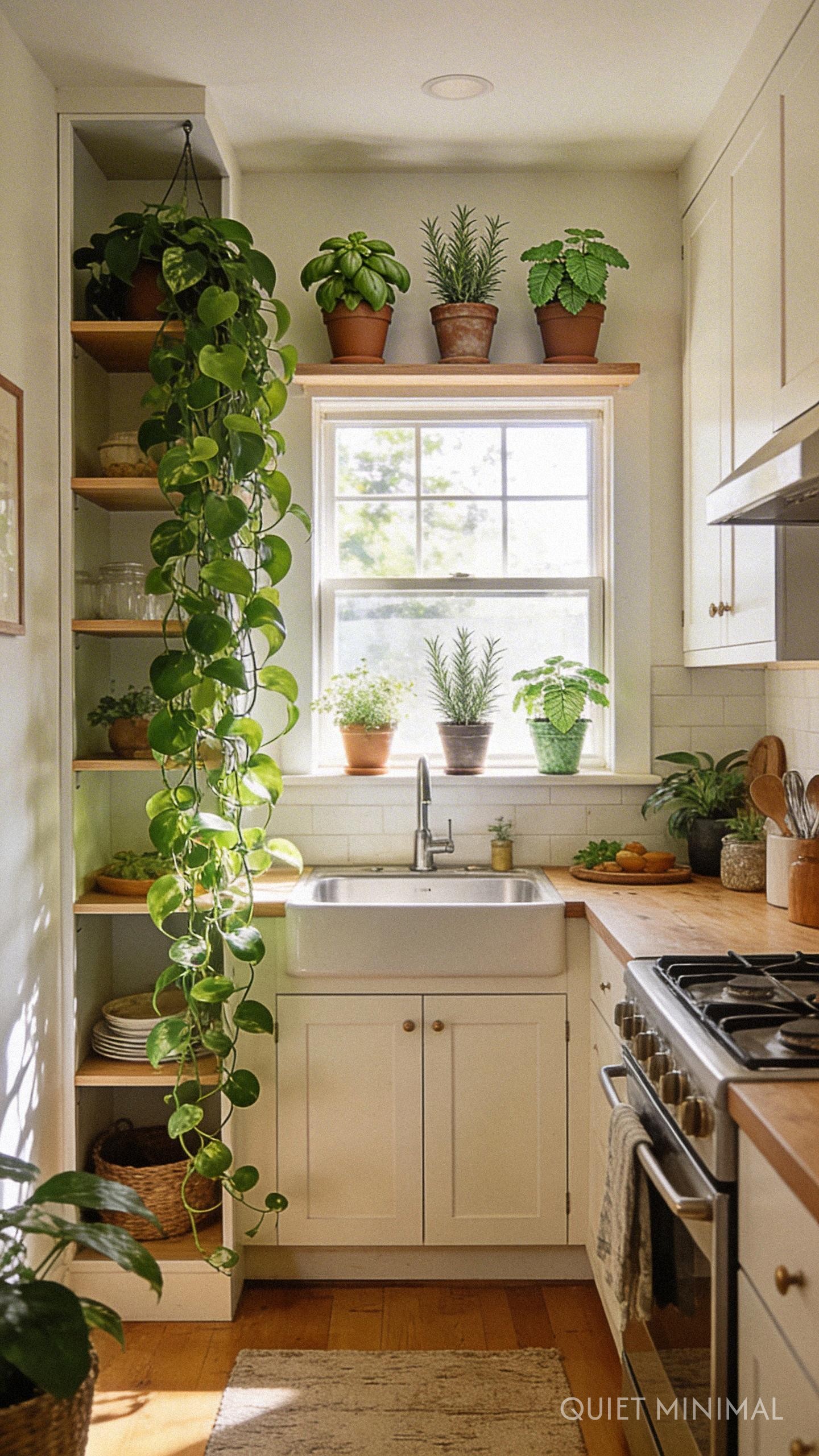 Key Takeaway: Add potted herbs, houseplants, or fresh-cut branches to bring life, natural color, and a sense of wellness into your kitchen space.
