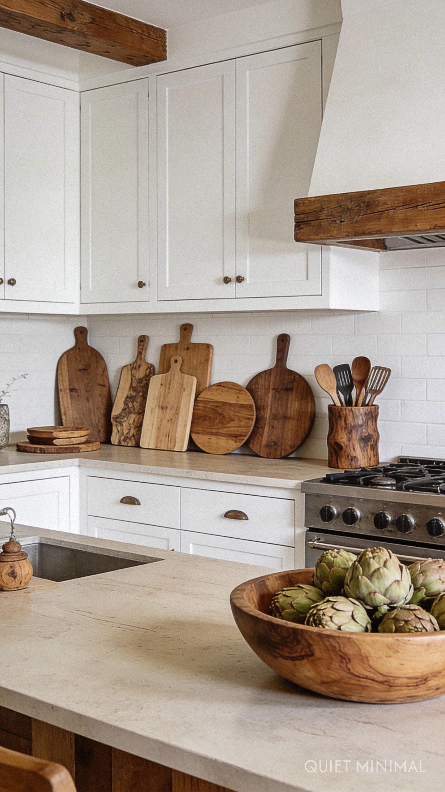 Key Takeaway: Incorporate wood elements through accessories like cutting boards, utensil holders, and bowls to add instant warmth and natural texture.