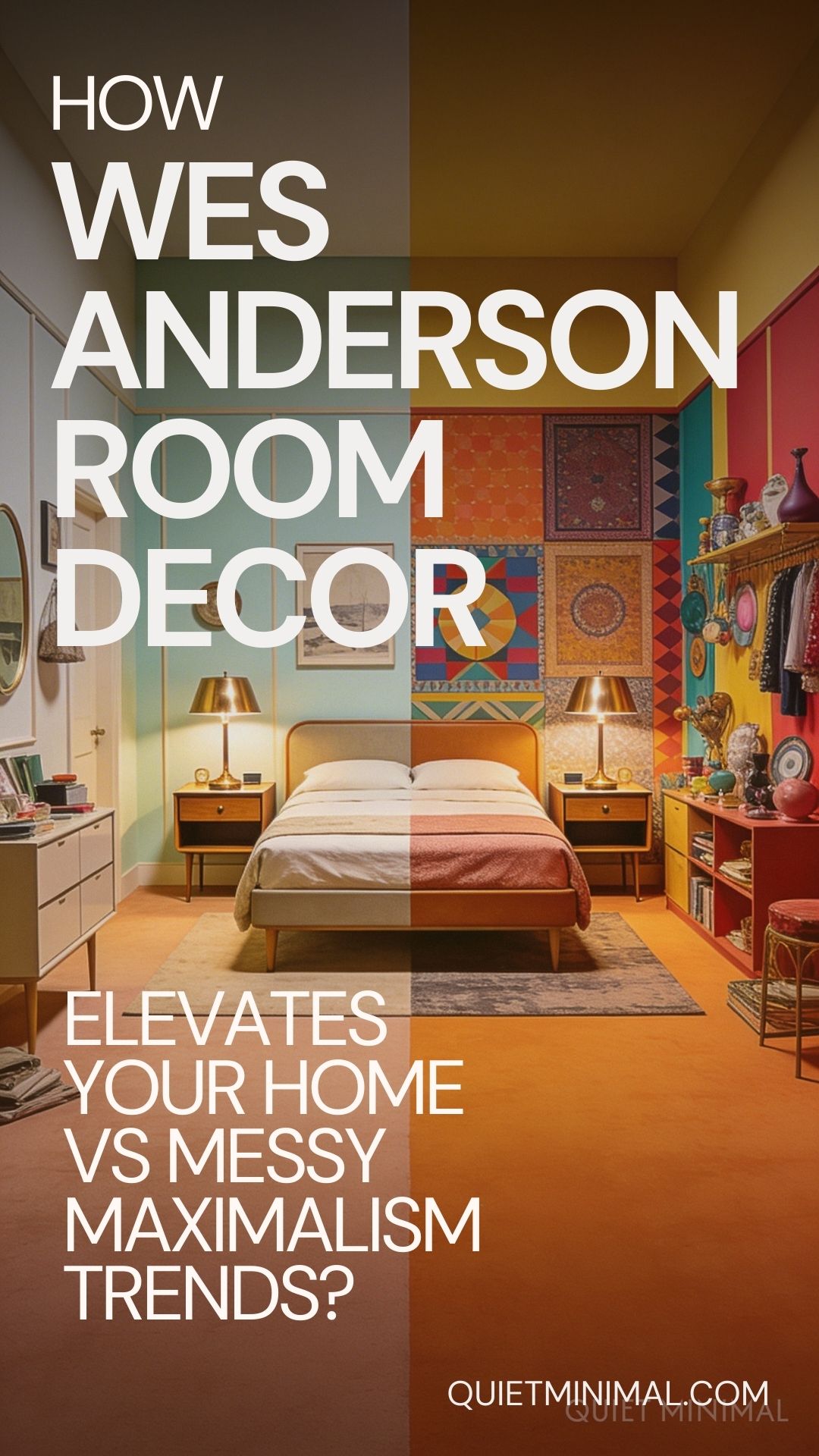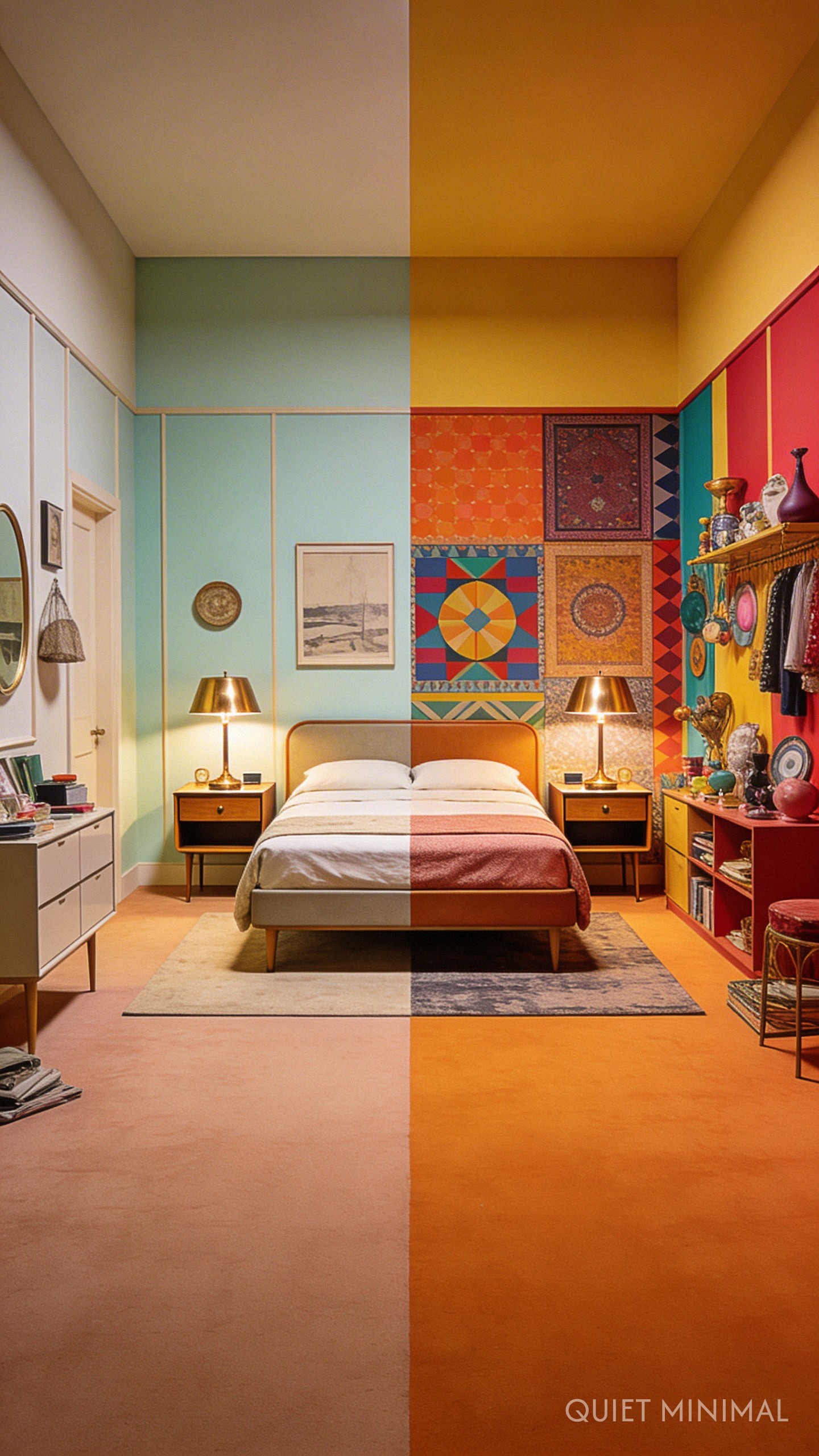 The hallmark of the “Andersonian” aesthetic is perfect symmetry. While messy maximalism scatters items haphazardly, a cinematic approach demands balance. If you place a mid-century side table on the left of your sofa, place a matching one on the right. Center your artwork perfectly above the bed.
