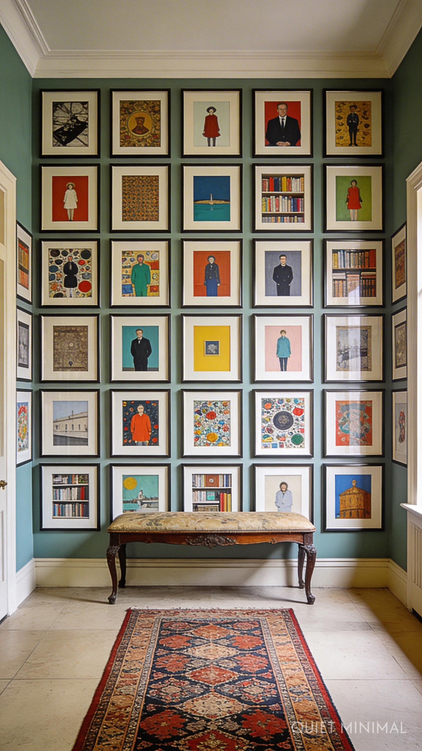 Key Takeaway: Uniform framing and grid layouts transform eclectic art into a sophisticated focal point.