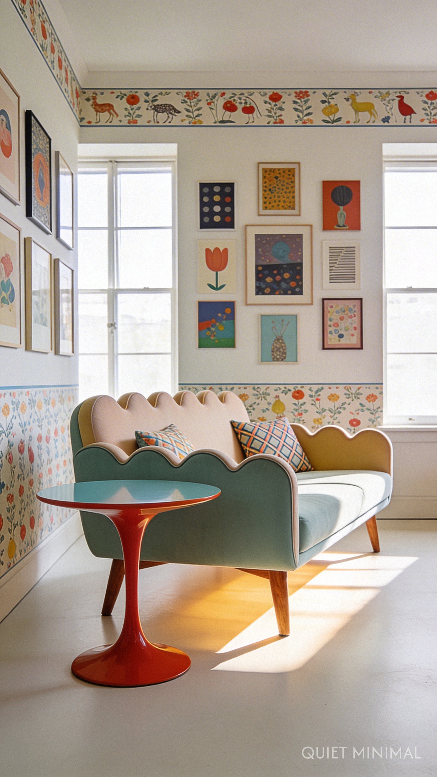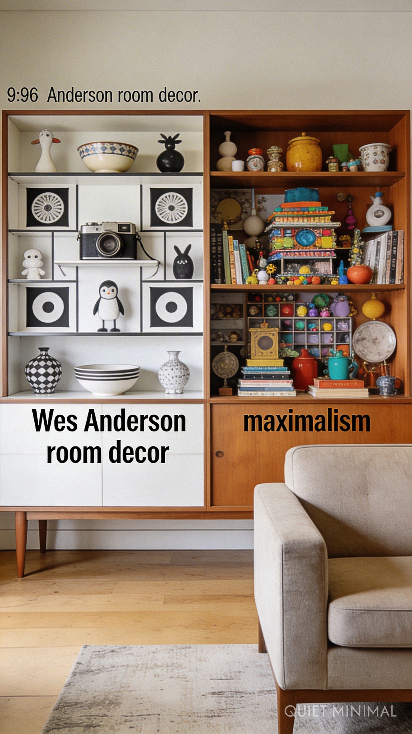 Messy maximalism often involves oversized, shapeless furniture that swallows the room. Wes Anderson interiors favor furniture with distinct, often mid-century silhouettes. Think sofas with visible legs, scalloped headboards, or tulip tables.