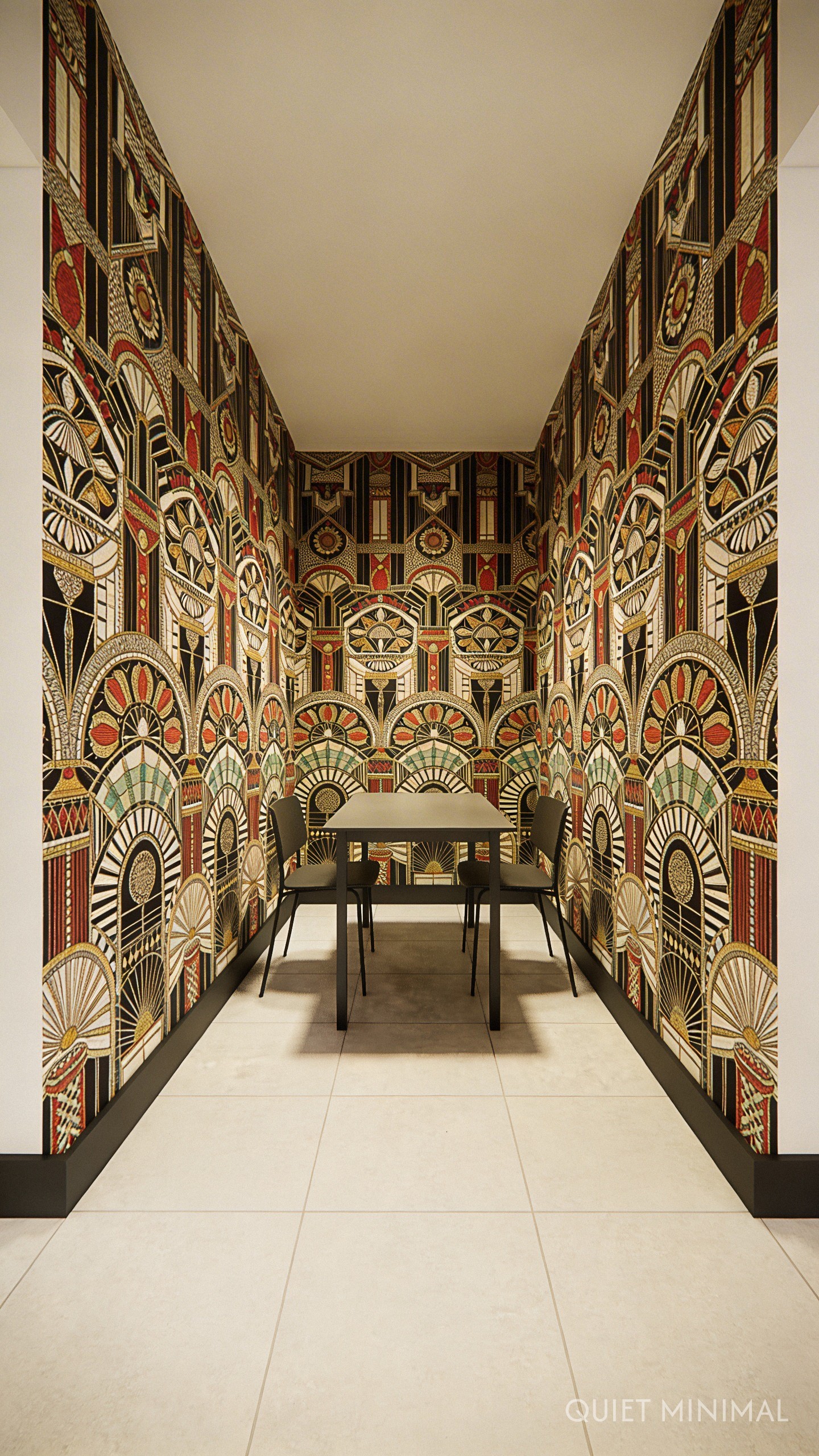 Key Takeaway: Let bold, patterned wallpaper serve as the main decor element, keeping furniture and accessories simple.