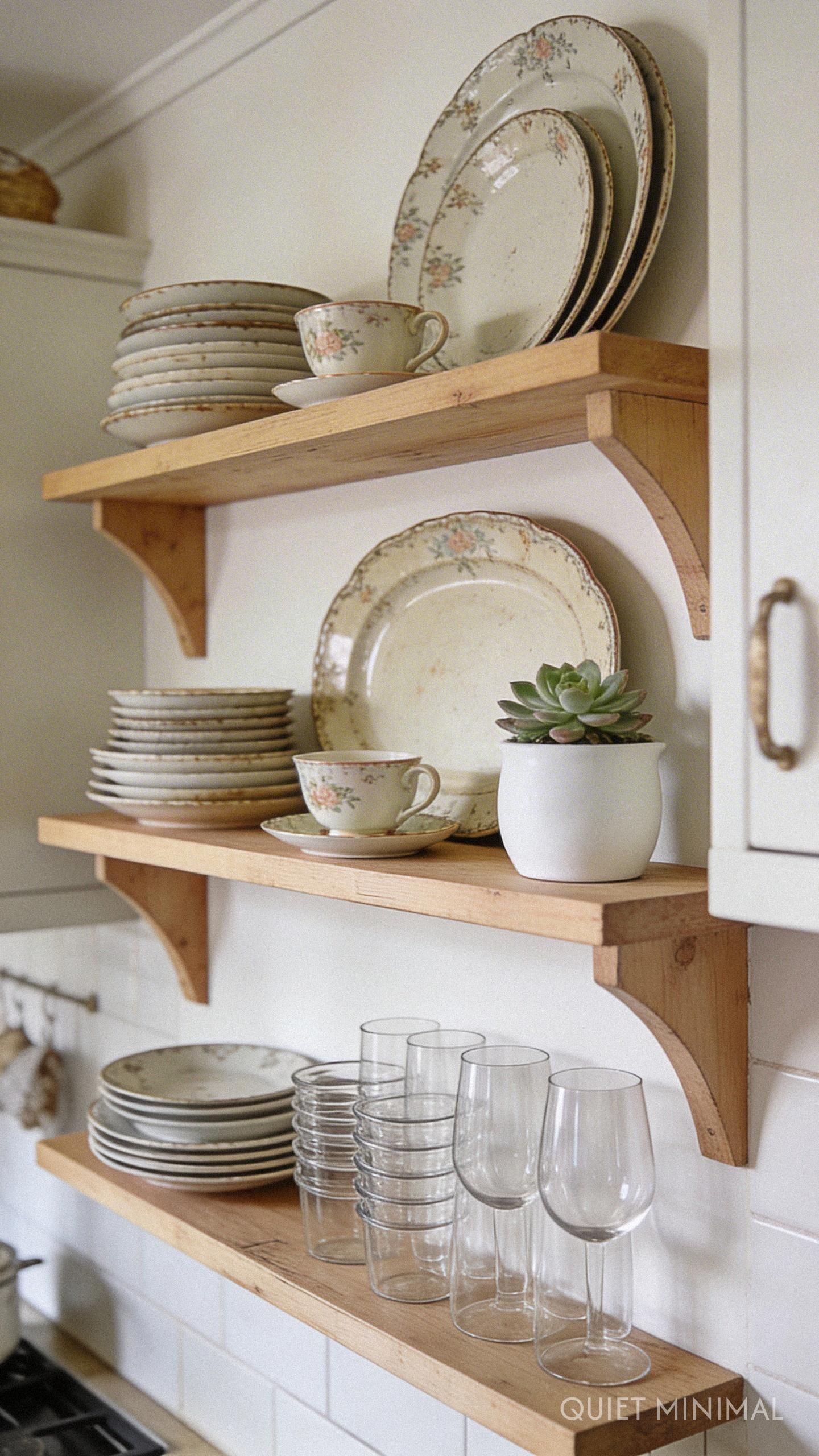 Open shelving is the perfect stage for your vintage china. Ditch the idea that every piece must be perfectly uniform. Instead, think like a stylist. Create visual interest by stacking plates of varying sizes, placing a delicate teacup in front of a larger platter, and turning a beautifully patterned saucer upright like a piece of art. Mix in a few modern elements like a simple glass or a small green plant to keep the look feeling fresh and current, not dated.