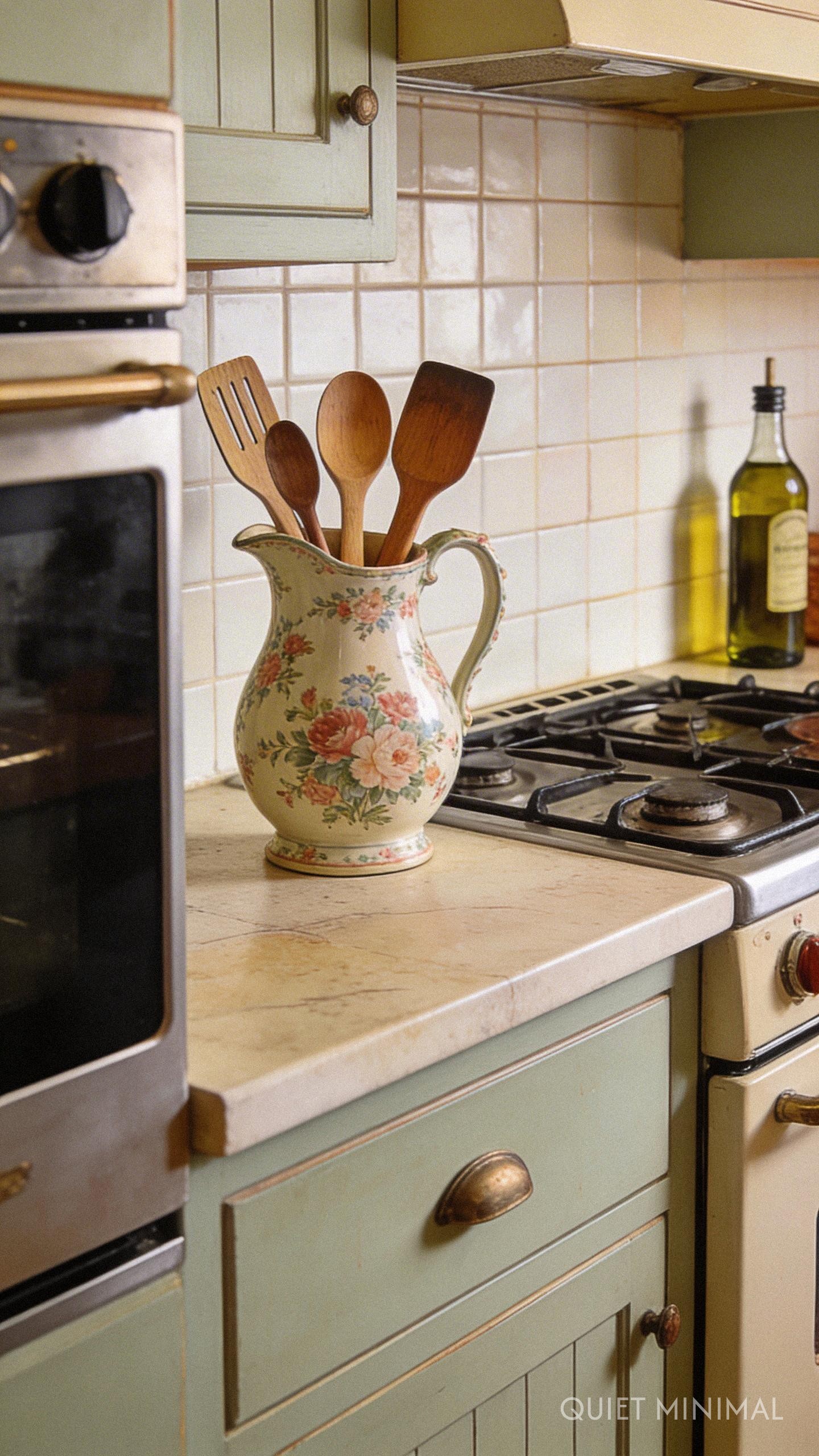 Key Takeaway: Swap out generic containers for vintage pitchers and creamers to use as unique, decorative holders for utensils and other small items.