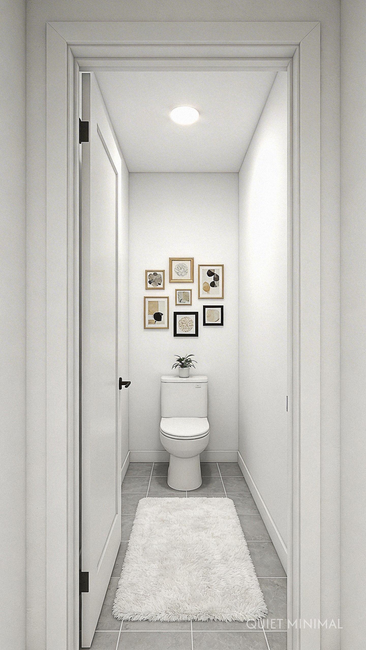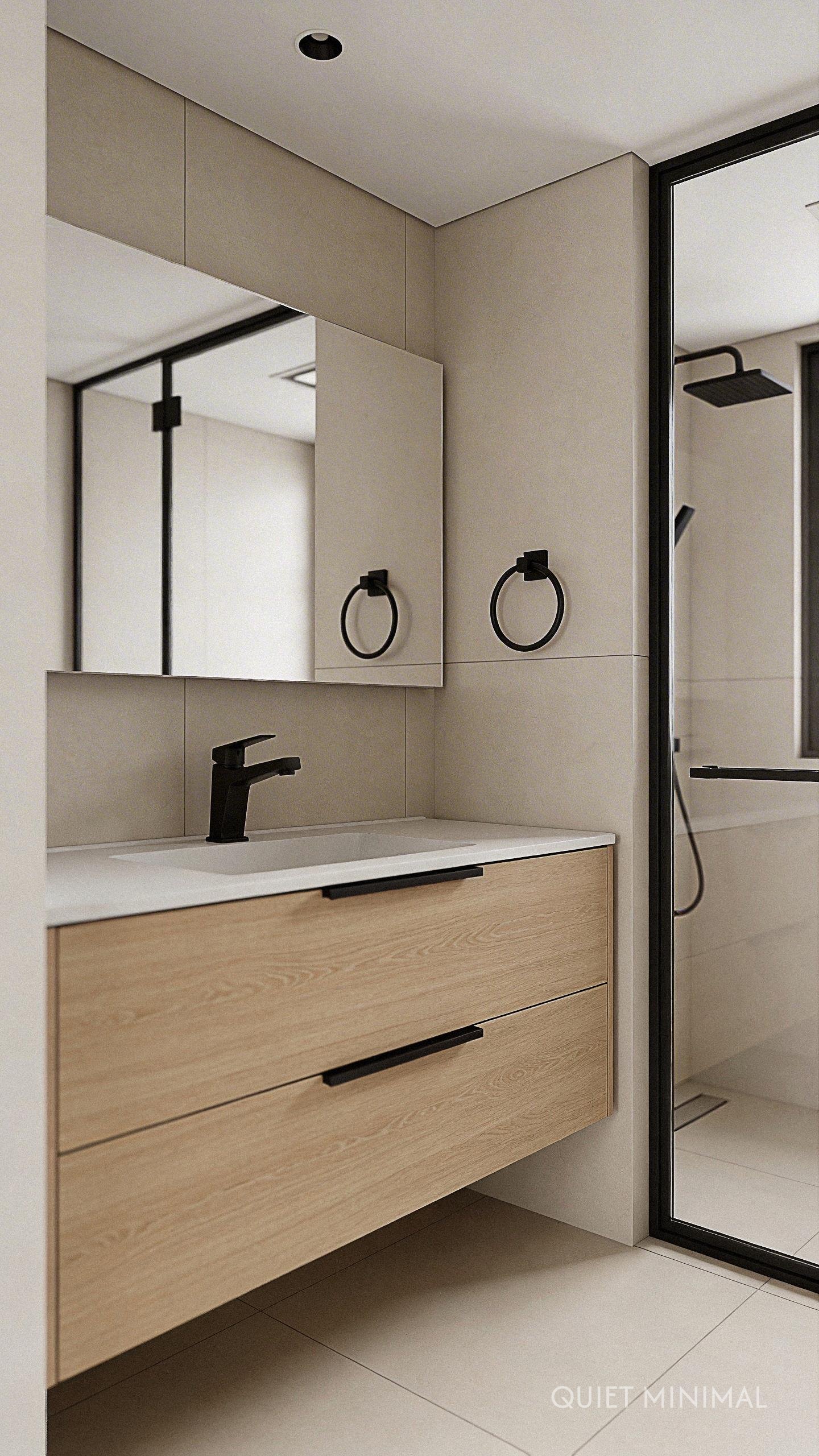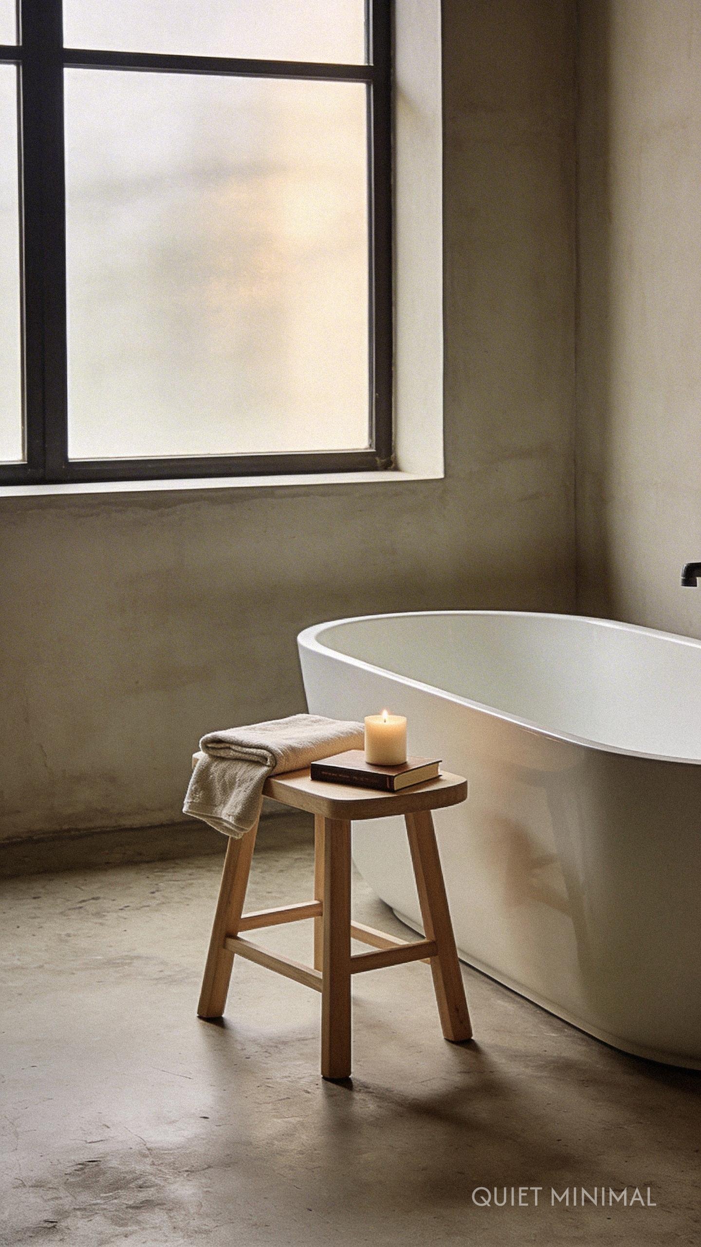 Key Takeaway: Introduce non-traditional bathroom items like a small stool, sculpture, or decorative vase to create an intentionally styled, gallery-like feel.