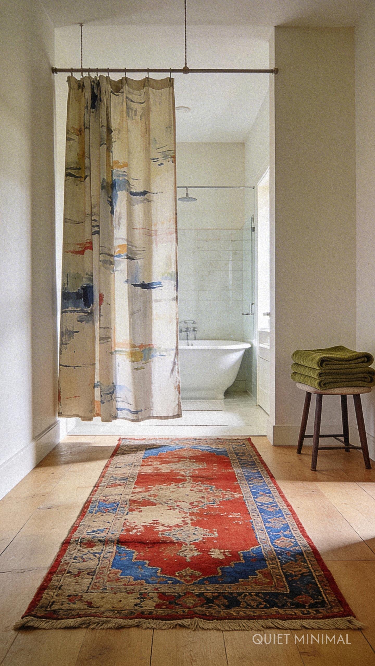 Art isn’t limited to what hangs on the walls. Introduce texture, pattern, and color through carefully chosen textiles. Ditch the generic bathmat for a small, vintage Turkish runner that adds a rich history and warmth to the floor. Swap out a plain plastic liner for a fabric shower curtain featuring an abstract print or a subtle, painterly design. Even your hand towels can be part of the vision—think Turkish cotton with hand-tied tassels or a stack of linen towels in a deep, earthy hue.