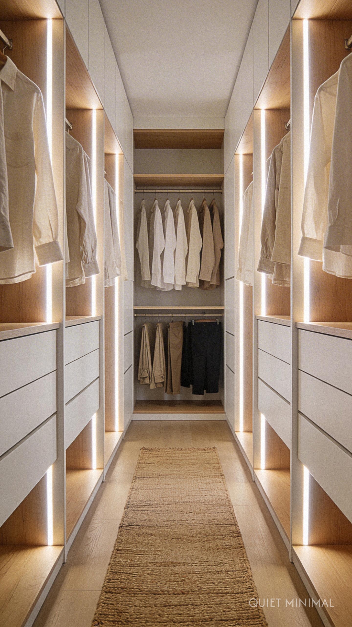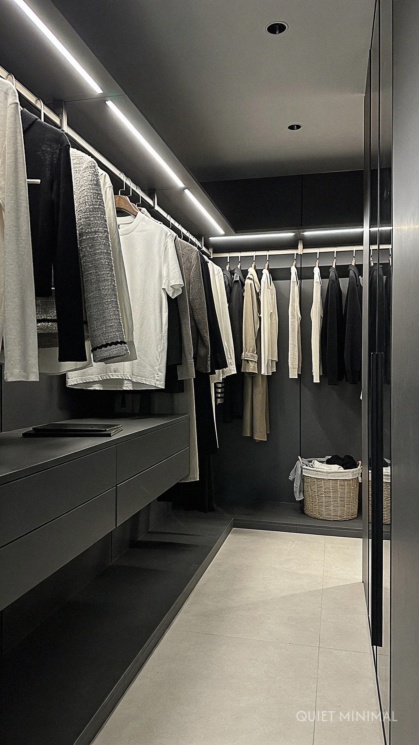 While technically horizontal, illuminated garment rods cast a vertical curtain of light down onto your clothes. This is one of the sleekest narrow walk-in closet ideas for modernizing a space. The LED strip is embedded on the underside of the hanging rod, acting as a task light for your wardrobe.