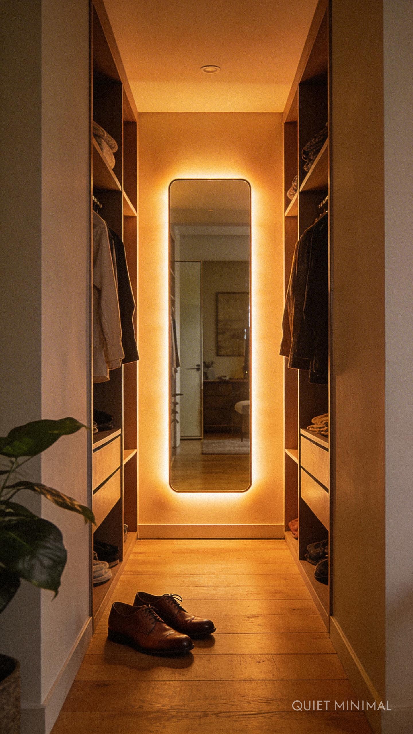 In a narrow walk-in closet, a mirror is non-negotiable for checking your outfit, but it also serves a dual purpose as a space-expander. To modernize this staple, opt for a floating mirror with vertical backlighting. The glow emanating from behind the mirror creates depth, separating the glass from the wall and adding a layer of dimension to the room.