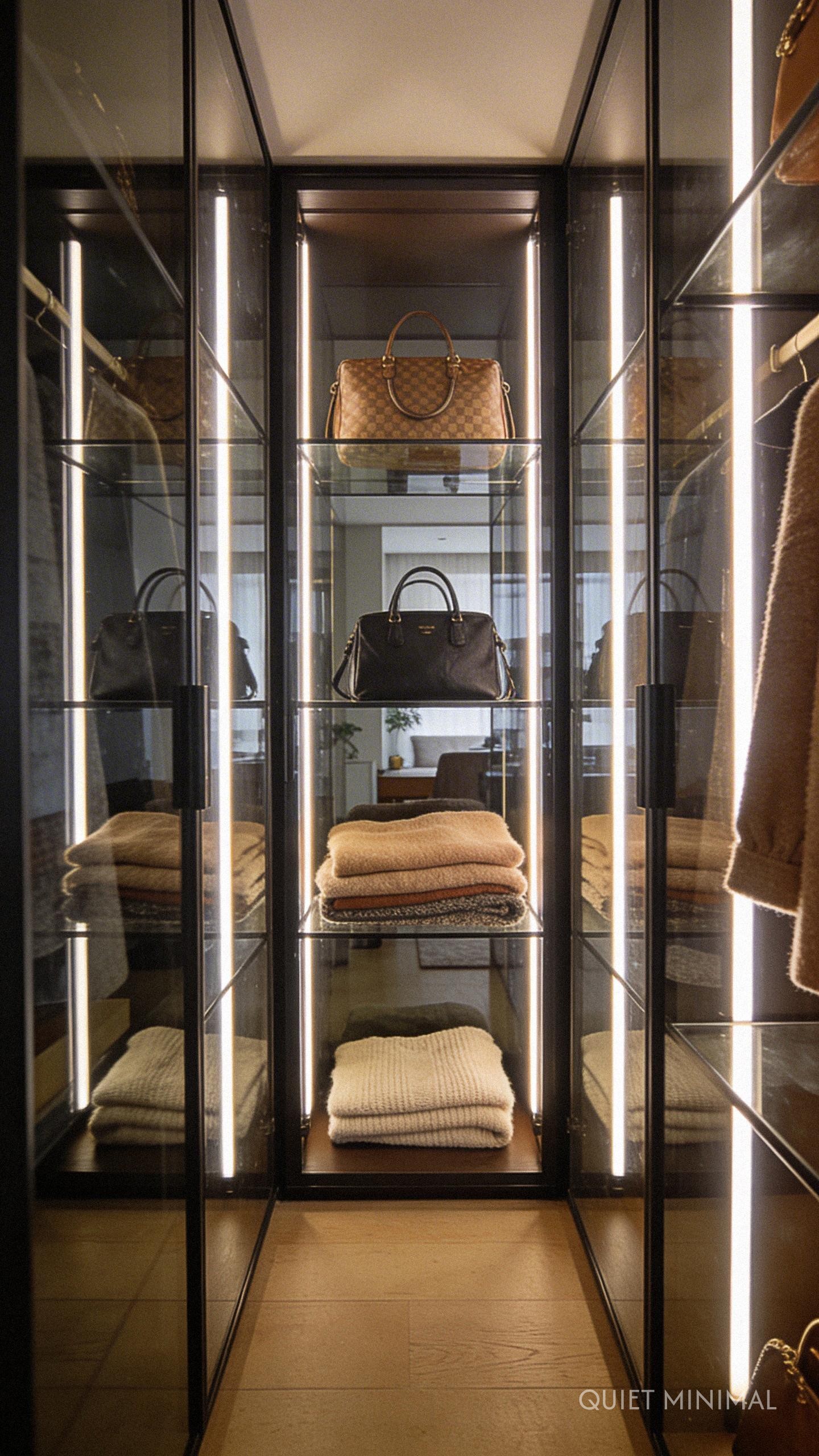 For the ultimate luxury feel, consider enclosing your shelves behind glass doors paired with internal vertical lighting. The glass reflects the light, bouncing it around the narrow room and creating an illusion of more space. It turns your handbags, shoes, or folded items into a museum-worthy display.