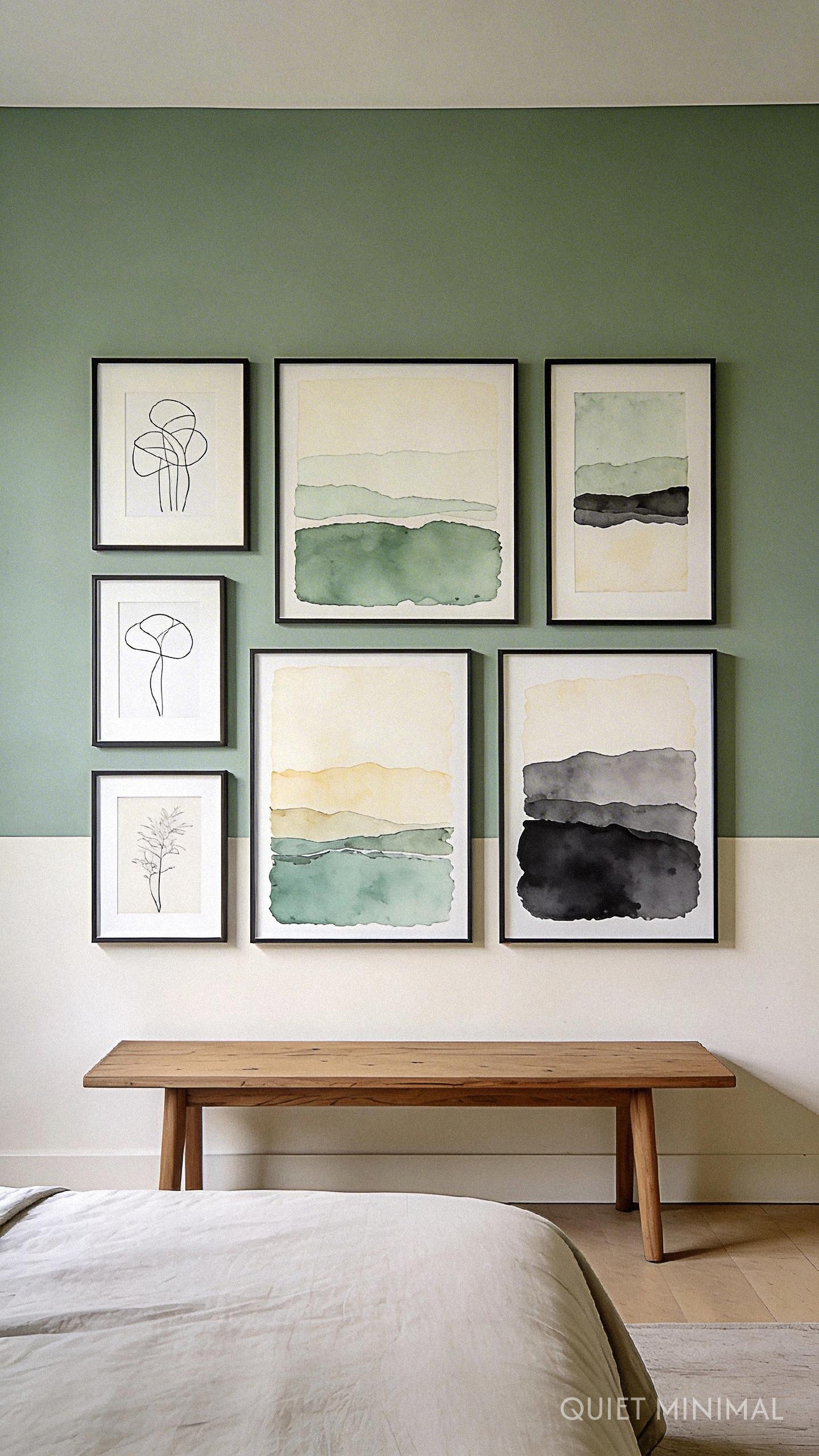 Key Takeaway: Create a gallery wall with a calming theme, using artwork that features sage green and nature-inspired motifs to promote peaceful thoughts before sleep.