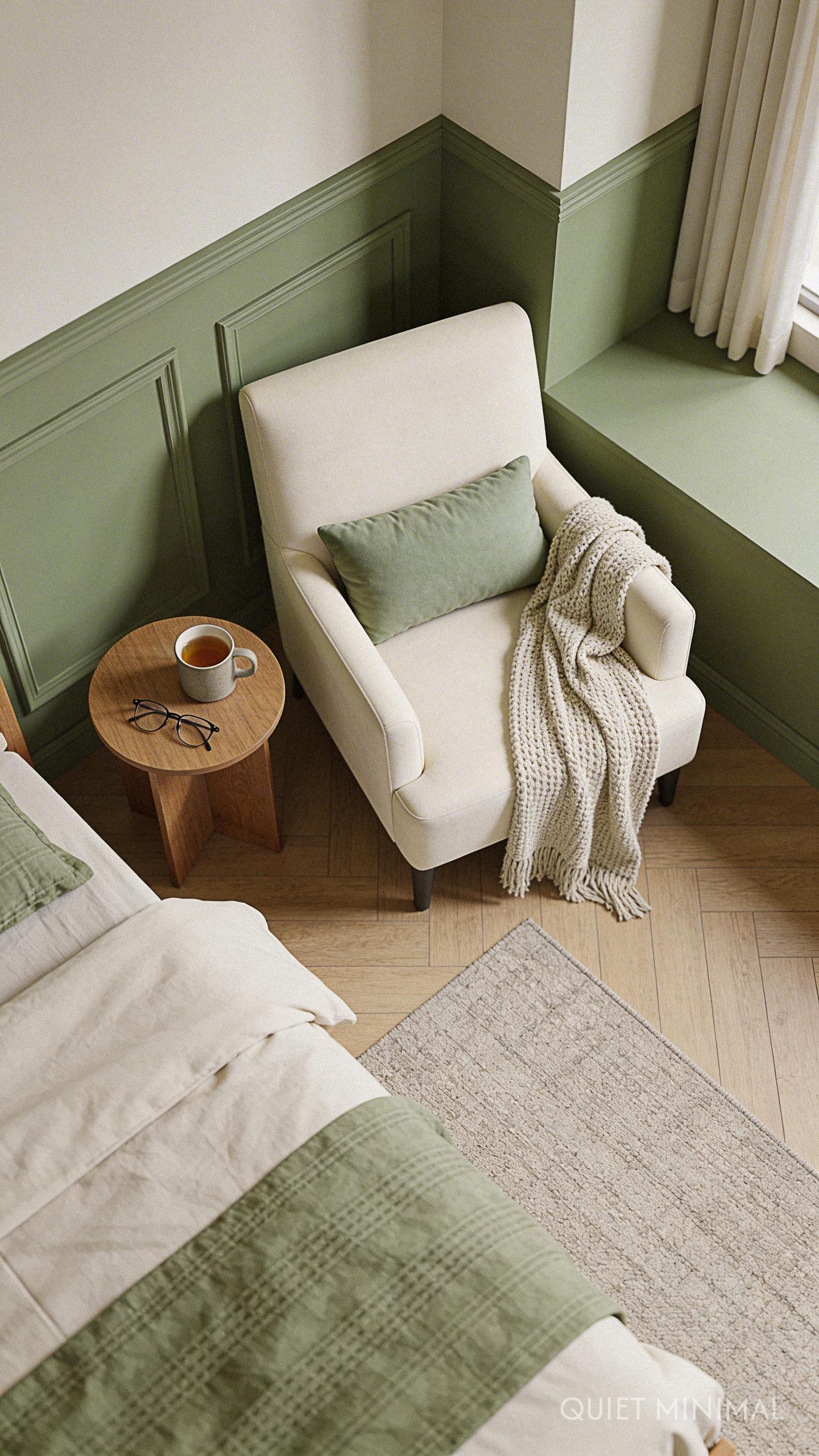 Key Takeaway: A dedicated “wind-down” corner with sage green accents creates a powerful psychological trigger, signaling that it’s time to relax and prepare for sleep.