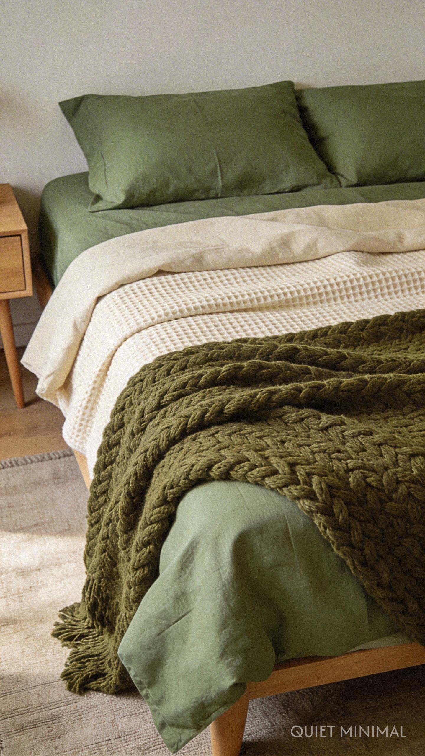 Key Takeaway: Combine different textures like linen, cotton, and wool in various shades of sage green to create a tactile and visually soothing bed that feels like a secure nest.