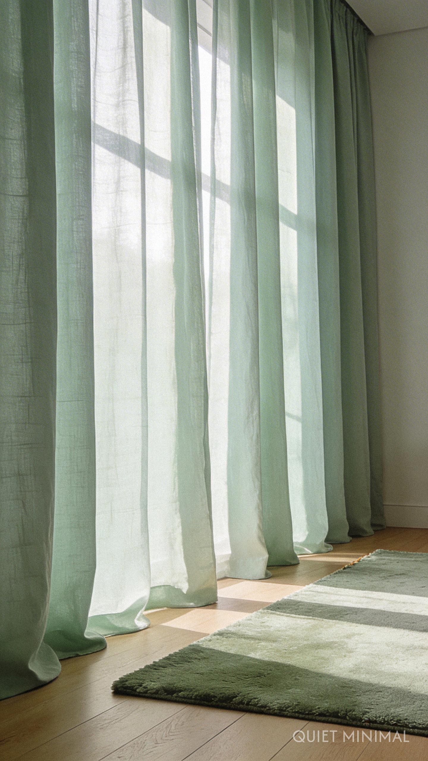 Extend the calming influence beyond your bed. A plush, low-pile area rug in a muted sage green can anchor the room and provide a soft, warm surface for your feet in the morning. Similarly, installing light-filtering linen curtains in a soft sage hue can diffuse harsh morning sunlight into a gentle, ethereal glow. These large surfaces of subtle color soften the room’s acoustics and light, creating a cocoon-like effect that fosters uninterrupted rest.